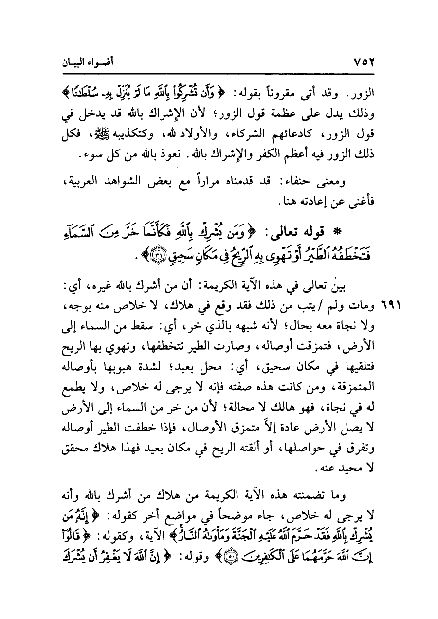 بين تعالى في هذه الآية الكريمة: أن من أشرك باللَّه غيره، أي: ومات ولم يتب من ذلك فقد وقع في هلاك، لا خلاص منه بوجه، ولا نجاة معه بحال؛ لأنه شبهه بالذي خر، أي: سقط من السماء إلى الأرض، فتمزقت أوصاله، وصارت الطير تتخطفها، وتهوي بها الريح فتلقيها في مكان سحيق، أي: محل بعيد؛ لشدة هبوبها بأوصاله المتمزقة، ومن كانت هذه صفته فإنه لا يرجى له خلاص، ولا يطمع له في نجاة، فهو هالك لا محالة؛ لأن من خر من السماء إلى الأرض لا يصل الأرض عادة إلَّا متمزق الأوصال، فإذا خطفت الطير أوصاله وتفرق في حواصلها، أو ألقته الريح في مكان بعيد فهذا هلاك محقق لا محيد عنه.
