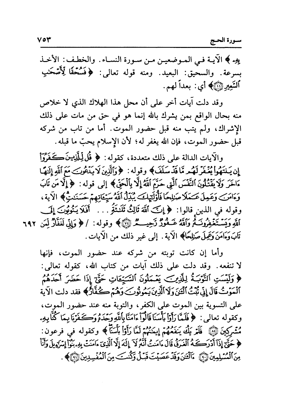 وقد دلت آيات أخر على أن محل هذا الهلاك الذي لا خلاص منه بحال الواقع بمن يشرك باللَّه إنما هو في حق من مات على ذلك الإِشراك، ولم يتب منه قبل حضور الموت. أما من تاب من شركه قبل حضور الموت، فإن الله يغفر له؛ لأن الإِسلام يجبّ ما قبله.