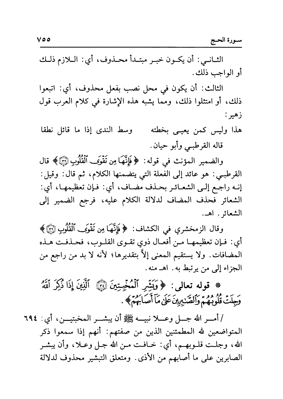 وقال الزمخشري في الكشاف: {فَإِنَّهَا مِنْ تَقْوَى الْقُلُوبِ (٣٢)} أي: فإن تعظيمها من أفعال ذوي تقوى القلوب، فحذفت هذه المضافات. ولا يستقيم المعنى إلَّا بتقديرها؛ لأنه لابد من راجع من الجزاء إلى من يرتبط به. اهـ منه.