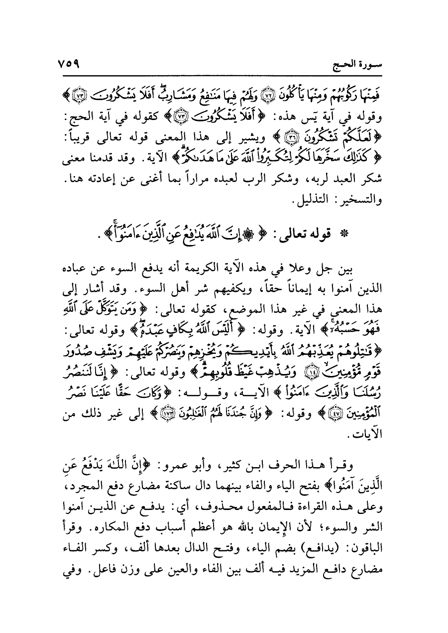 وقرأ هذا الحرف ابن كثير، وأبو عمرو: {إِنَّ اللَّهَ يُدَافِعُ عَنِ الَّذِينَ آمَنُوا} بفتح الياء والفاء بينهما دال ساكنة مضارع دفع المجرد، وعلى هذه القراءة فالمفعول محذوف، أي: يدفع عن الذين آمنوا الشر والسوء؛ لأن الإِيمان باللَّه هو أعظم أسباب دفع المكاره. وقرأ الباقون: (يدافع) بضم الياء، وفتح الدال بعدها ألف، وكسر الفاء مضارع دافع المزيد فيه ألف بين الفاء والعين على وزن فاعل. وفي