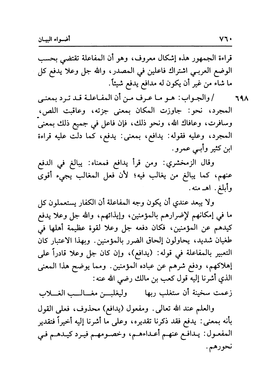ولا يبعد عندي أن يكون وجه المفاعلة أن الكفار يستعملون كل ما في إمكانهم لإِضرارهم بالمؤمنين، وإيذائهم، واللَّه جل وعلا يدفع كيدهم عن المؤمنين، فكان دفعه جل وعلا لقوة عظيمة أهلها في طغيان شديد، يحاولون إلحاق الضرر بالمؤمنين. وبهذا الاعتبار كان التعبير بالمفاعلة في قوله: (يدافع)، وإن كان جل وعلا قادرًا على إهلاكهم، ودفع شرهم عن عباده المؤمنين. ومما يوضح هذا المعنى الذي أشرنا إليه قول كعب بن مالك رضي الله عنه: