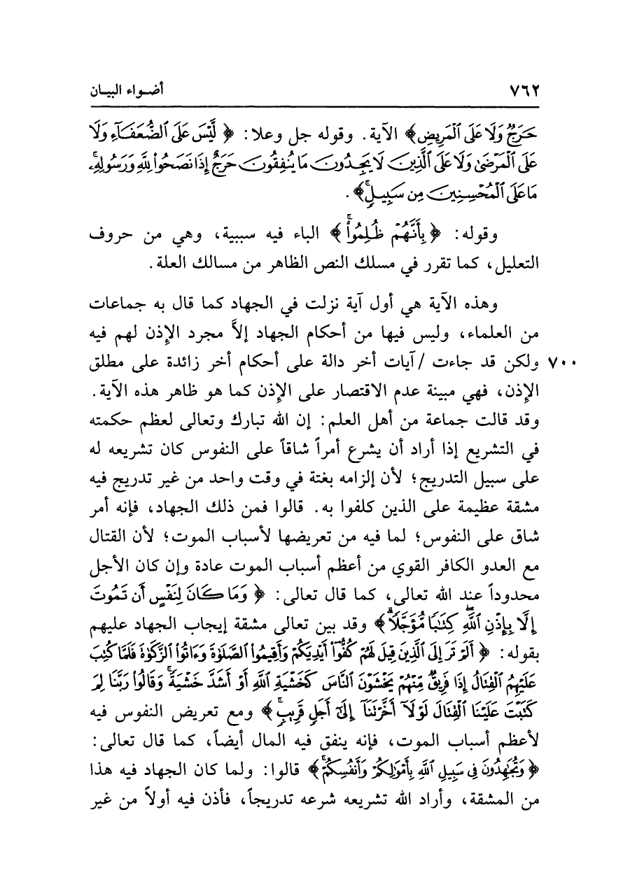 وهذه الآية هي أول آية نزلت في الجهاد كما قال به جماعات من العلماء، وليس فيها من أحكام الجهاد إلَّا مجرد الإِذن لهم فيه ولكن قد جاءت آيات أخر دالة على أحكام أخر زائدة على مطلق الإِذن، فهي مبينة عدم الاقتصار على الإِذن كما هو ظاهر هذه الآية. وقد قالت جماعة من أهل العلم: إن الله تبارك وتعالى لعظم حكمته في التشريع إذا أراد أن يشرع أمرًا شاقًا على النفوس كان تشريعه له على سبيل التدريج؛ لأن إلزامه بغتة في وقت واحد من غير تدريج فيه مشقة عظيمة على الذين كلفوا به. قالوا فمن ذلك الجهاد، فإنه أمر شاق على النفوس؛ لما فيه من تعريضها لأسباب الموت؛ لأن القتال مع العدو الكافر القوي من أعظم أسباب الموت عادة وإن كان الأجل محدودًا عند الله تعالى، كما قال تعالى: {وَمَا كَانَ لِنَفْسٍ أَنْ تَمُوتَ إِلَّا بِإِذْنِ اللَّهِ كِتَابًا مُؤَجَّلًا} وقد بين تعالى مشقة إيجاب الجهاد عليهم بقوله: {أَلَمْ تَرَ إِلَى الَّذِينَ قِيلَ لَهُمْ كُفُّوا أَيْدِيَكُمْ وَأَقِيمُوا الصَّلَاةَ وَآتُوا الزَّكَاةَ فَلَمَّا كُتِبَ عَلَيْهِمُ الْقِتَالُ إِذَا فَرِيقٌ مِنْهُمْ يَخْشَوْنَ النَّاسَ كَخَشْيَةِ اللَّهِ أَوْ أَشَدَّ خَشْيَةً وَقَالُوا رَبَّنَا لِمَ كَتَبْتَ عَلَيْنَا الْقِتَالَ لَوْلَا أَخَّرْتَنَا إِلَى أَجَلٍ قَرِيبٍ} ومع تعريض النفوس فيه لأعظم أسباب الموت، فإنه ينفق فيه المال أيضًا، كما قال تعالى: {وَتُجَاهِدُونَ فِي سَبِيلِ اللَّهِ بِأَمْوَالِكُمْ وَأَنْفُسِكُمْ} قالوا: ولما كان الجهاد فيه هذا من المشقة، وأراد الله تشريعه شرعه تدريجًا، فأذن فيه أولًا من غير