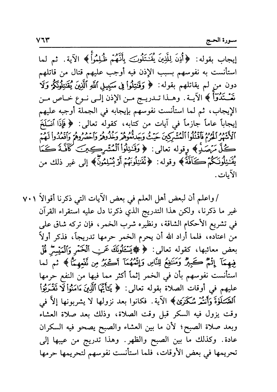 واعلم أن لبعض أهل العلم في بعض الآيات التي ذكرنا أقوالًا غير ما ذكرنا، ولكن هذا التدريج الذي ذكرنا دل عليه استقراء القرآن في تشريع الأحكام الشاقة، ونظيره شرب الخمر، فإن تركه شاق على من اعتاده، فلما أراد الله أن يحرم الخمر حرمها تدريجًا، فذكر أولًا بعض معائبها، كقوله تعالى: {يَسْأَلُونَكَ عَنِ الْخَمْرِ وَالْمَيْسِرِ قُلْ فِيهِمَا إِثْمٌ كَبِيرٌ وَمَنَافِعُ لِلنَّاسِ وَإِثْمُهُمَا أَكْبَرُ مِنْ نَفْعِهِمَا} ثم لما استأنست نفوسهم بأن في الخمر إثمًا أكثر مما فيها من النفع حرمها عليهم في أوقات الصلاة بقوله تعالى: {يَاأَيُّهَا الَّذِينَ آمَنُوا لَا تَقْرَبُوا الصَّلَاةَ وَأَنْتُمْ سُكَارَى} الآية. فكانوا بعد نزولها لا يشربونها إلَّا في وقت يزول فيه السكر قبل وقت الصلاة، وذلك بعد صلاة العشاء وبعد صلاة الصبح؛ لأن ما بين العشاء والصبح يصحو فيه السكران عادة. وكذلك ما بين الصبح والظهر. وهذا تدريج من عيبها إلى تحريمها في بعض الأوقات، فلما استأنست نفوسهم لتحريمها حرمها