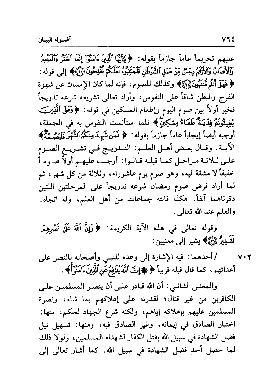 عليهم تحريمًا عامًا جازمًا بقوله: {يَاأَيُّهَا الَّذِينَ آمَنُوا إِنَّمَا الْخَمْرُ وَالْمَيْسِرُ وَالْأَنْصَابُ وَالْأَزْلَامُ رِجْسٌ مِنْ عَمَلِ الشَّيْطَانِ فَاجْتَنِبُوهُ لَعَلَّكُمْ تُفْلِحُونَ (٩٠)} إلى قوله: {فَهَلْ أَنْتُمْ مُنْتَهُونَ (٩١)} وكذلك للصوم، فإنه لما كان الإِمساك عن شهوة الفرج والبطن شاقًا على النفوس، وأراد تعالى تشريعه شرعه تدريجًا فخير أولًا بين صوم اليوم وإطعام المسكين في قوله: {وَعَلَى الَّذِينَ يُطِيقُونَهُ فِدْيَةٌ طَعَامُ مِسْكِينٍ} فلما استأنست النفوس به في الجملة، أوجبه أيضًا إيجابًا عامًا جازمًا بقوله: {فَمَنْ شَهِدَ مِنْكُمُ الشَّهْرَ فَلْيَصُمْهُ} الآية. وقال بعض أهل العلم: التدريج في تشريع الصوم على ثلاثة مراحل كما قبله قالوا: أوجب عليهم أولًا صومًا خفيفًا لا مشقة فيه، وهو صوم يوم عاشوراء، وثلاثة من كل شهر، ثم لما أراد فرض صوم رمضان شرعه تدريجًا على المرحلتين اللتين ذكرناهما آنفًا. هكذا قالته جماعات من أهل العلم، وله اتجاه. والعلم عند الله تعالى.