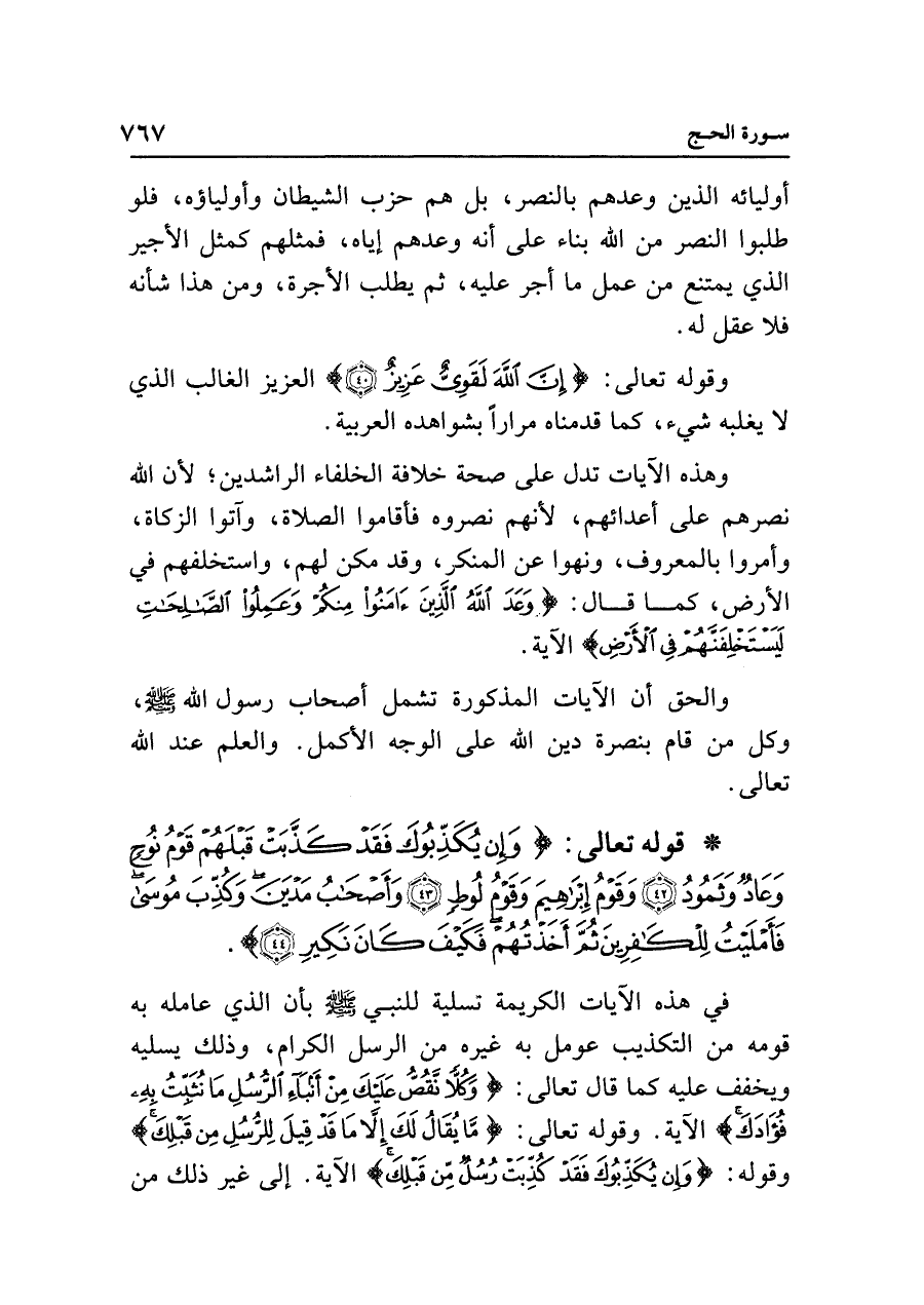وهذه الآيات تدل على صحة خلافة الخلفاء الراشدين؛ لأن الله نصرهم على أعدائهم، لأنهم نصروه فأقاموا الصلاة، وآتوا الزكاة، وأمروا بالمعروف، ونهوا عن المنكر، وقد مكن لهم، واستخلفهم في الأرض، كما قال: {وَعَدَ اللَّهُ الَّذِينَ آمَنُوا مِنْكُمْ وَعَمِلُوا الصَّالِحَاتِ لَيَسْتَخْلِفَنَّهُمْ فِي الْأَرْضِ} الآية.
