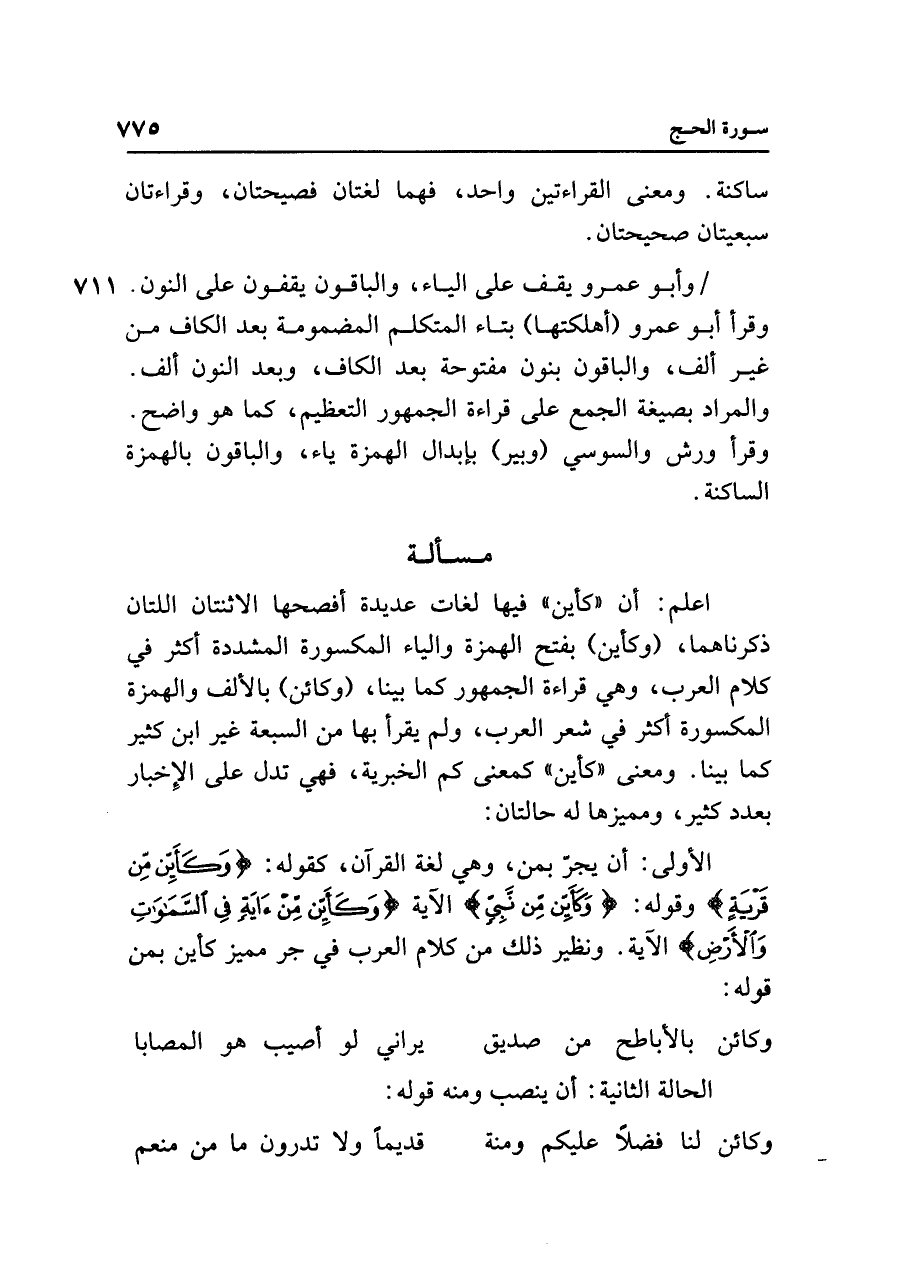 اعلم: أن "كأين" فيها لغات عديدة أفصحها الاثنتان اللتان ذكرناهما، (وكأين) بفتح الهمزة والياء المكسورة المشددة أكثر في كلام العرب، وهي قراءة الجمهور كما بينا، (وكائن) بالألف والهمزة المكسورة أكثر في شعر العرب، ولم يقرأ بها من السبعة غير ابن كثير كما بينا. ومعنى "كأين" كمعنى كم الخبرية، فهي تدل على الإِخبار بعدد كثير، ومميزها له حالتان:
