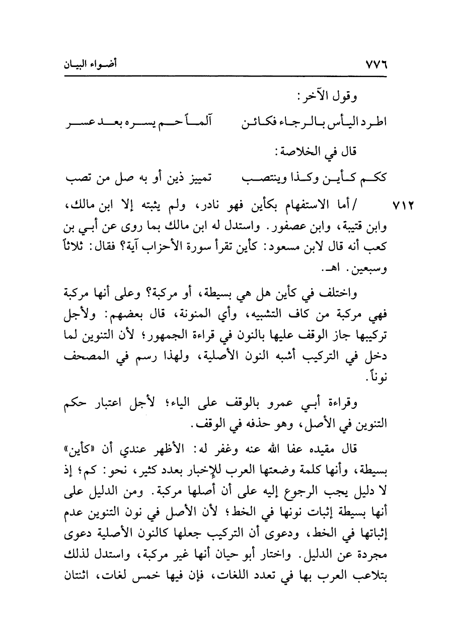 قال مقيده عفا الله عنه وغفر له: الأظهر عندي أن "كأين" بسيطة، وأنها كلمة وضعتها العرب للإِخبار بعدد كثير، نحو: كم، إذ لا دليل يجب الرجوع إليه على أن أصلها مركبة. ومن الدليل على أنها بسيطة إثبات نونها في الخط؛ لأن الأصل في نون التنوين عدم إثباتها في الخط، ودعوى أن التركيب جعلها كالنون الأصلية دعوى مجردة عن الدليل. واختار أبو حيان أنها غير مركبة، واستدل لذلك بتلاعب العرب بها في تعدد اللغات، فإن فيها خمس لغات، اثنتان