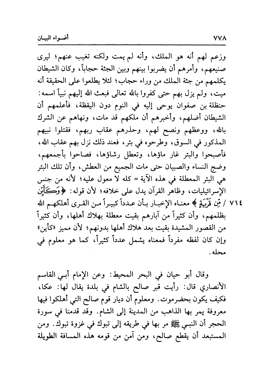 وزعم لهم أنه هو الملك، وأنه لم يمت ولكنه تغيب عنهم؛ ليرى صنيعهم، وأمرهم أن يضربوا بينهم وبين الجثة حجابًا، وكان الشيطان يكلمهم من جثة الملك من وراء حجاب؛ لئلا يطلعوا على الحقيقة أنه ميت، ولم يزل بهم حتى كفروا باللَّه تعالى فبعث الله إليهم نبيًا اسمه: حنظلة بن صفوان يوحى إليه في النوم دون اليقظة، فأعلمهم أن الشيطان أضلهم، وأخبرهم أن ملكهم قد مات، ونهاهم عن الشرك باللَّه، ووعظهم ونصح لهم، وحذرهم عقاب ربهم، فقتلوا نبيهم المذكور في السوق، وطرحوه في بئر، فعند ذلك نزل بهم عقاب الله، فأصبحوا والبئر غار ماؤها، وتعطل رشاؤها، فصاحوا بأجمعهم، وضج النساء والصبيان حتى مات الجميع من العطش، وأن تلك البئر هي البئر المعطلة في هذه الآية = كله لا معول عليه؛ لأنه من جنس الإِسرائيليات، وظاهر القرآن يدل على خلافه؛ لأن قوله: {وَكَأَيِّنْ مِنْ قَرْيَةٍ} معناه الإِخبار بأن عددًا كبيرًا من القرى أهلكهم الله بظلمهم، وأن كثيرًا من آبارهم بقيت معطلة بهلاك أهلها، وأن كثيرًا من القصور المشيدة بقيت بعد هلاك أهلها بدونهم؛ لأن مميز "كأين" وإن كان لفظه مفردًا فمعناه يشمل عددًا كثيرًا، كما هو معلوم في محله.