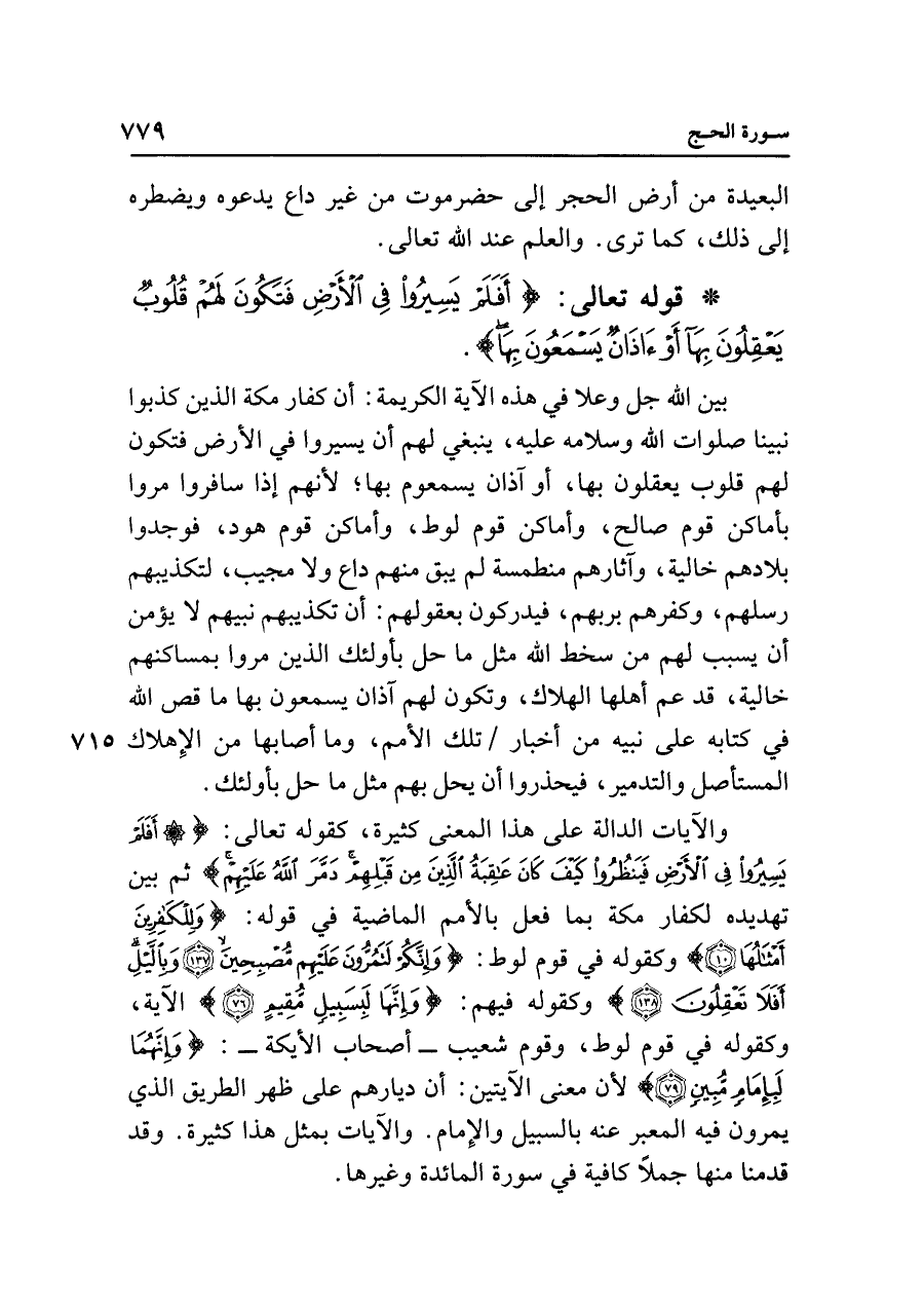 بين الله جل وعلا في هذه الآية الكريمة: أن كفار مكة الذين كذبوا نبينا صلوات الله وسلامه عليه، ينبغي لهم أن يسيروا في الأرض فتكون لهم قلوب يعقلون بها، أو آذان يسمعون بها؛ لأنهم إذا سافروا مروا بأماكن قوم صالح، وأماكن قوم لوط، وأماكن قوم هود، فوجدوا بلادهم خالية، وآثارهم منطمسة لم يبق منهم داع ولا مجيب، لتكذيبهم رسلهم، وكفرهم بربهم، فيدركون بعقولهم: أن تكذيبهم نبيهم لا يؤمن أن يسبب لهم من سخط الله مثل ما حل بأولئك الذين مروا بمساكنهم خالية، قد عم أهلها الهلاك، وتكون لهم آذان يسمعون بها ما قص الله في كتابه على نبيه من أخبار تلك الأمم، وما أصابها من الإِهلاك المستأصل والتدمير، فيحذروا أن يحل بهم مثل ما حل بأولئك.
