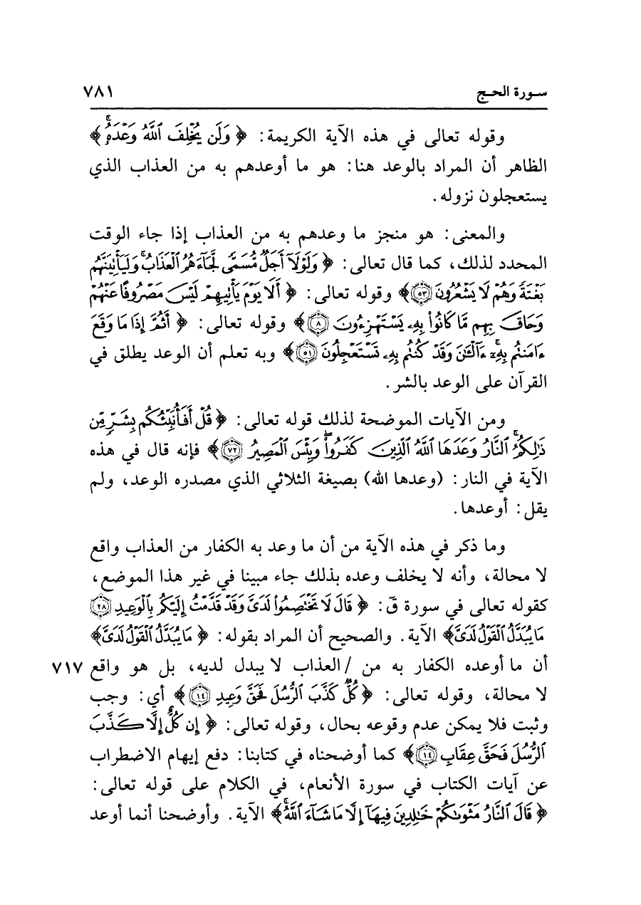 وقوله تعالى في هذه الآية الكريمة: {وَلَنْ يُخْلِفَ اللَّهُ وَعْدَهُ} الظاهر أن المراد بالوعد هنا: هو ما أوعدهم به من العذاب الذي يستعجلون نزوله.