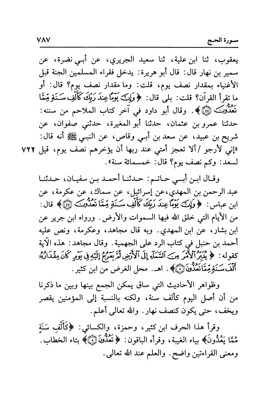 يعقوب، ثنا ابن علية، ثنا سعيد الجريري، عن أبي نضرة، عن سمير بن نهار قال: قال أبو هريرة: يدخل فقراء المسلمين الجنة قبل الأغنياء بمقدار نصف يوم، قلت: وما مقدار نصف يوم؟ قال: أو ما تقرأ القرآن؟ قلت: بلى قال: {وَإِنَّ يَوْمًا عِنْدَ رَبِّكَ كَأَلْفِ سَنَةٍ مِمَّا تَعُدُّونَ (٤٧)}. وقال أبو داود في آخر كتاب الملاحم من سننه: حدثنا عمرو بن عثمان، حدثنا أبو المغيرة، حدثني صفوان، عن شريح بن عبيد، عن سعد بن أبي وقاص، عن النبي - صلى الله عليه وسلم - أنه قال: "إني لأرجو ألا تعجز أمتي عند ربها أن يؤخرهم نصف يوم، قيل لسعد: وكم نصف يوم؟ قال: خمسمائة سنة".