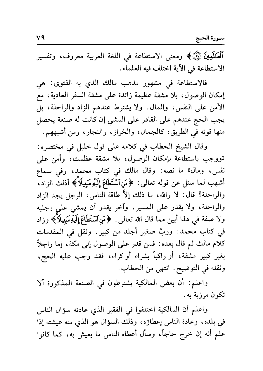 وقال الشيخ الحطاب في كلامه على قول خليل في مختصره: "ووجب باستطاعة بإمكان الوصول، بلا مشقة عظمت، وأمن على نفس، ومال" ما نصه: وقال مالك في كتاب محمد، وفي سماع أشهب لما سئل عن قوله تعالى: {مَنِ اسْتَطَاعَ إِلَيهِ سَبِيلًا} أذلك الزاد، والراحلة؟ قال: لا والله، ما ذلك إلَّا طاقة الناس، الرجل يجد الزاد والراحلة، ولا يقدر على المسير، وآخر يقدر أن يمشي علي رجليه ولا صفة في هذا أبين مما قال الله تعالى: {مَنِ اسْتَطَاعَ إِلَيهِ سَبِيلًا} وزاد في كتاب محمد: وربَّ صغير أجلد من كبير. ونقل في المقدمات كلام مالك ثم قال بعده: فمن قدر على الوصول إلى مكة، إما راجلًا بغير كبير مشقة، أو راكبًا بشراء أو كراء، فقد وجب عليه الحج، ونقله في التوضيح. انتهى من الحطاب.