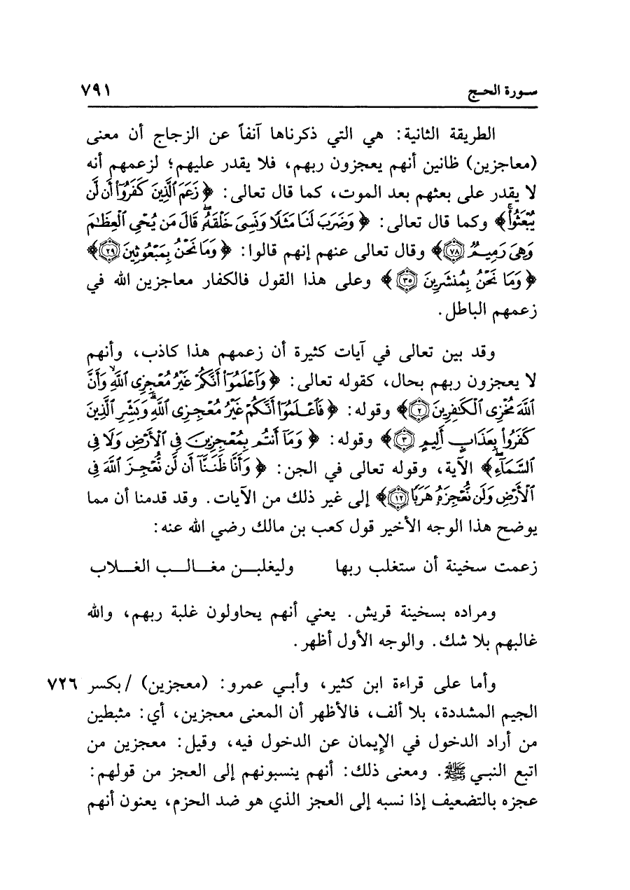 الطريقة الثانية: هي التي ذكرناها آنفًا عن الزجاج أن معنى (معاجزين) ظانين أنهم يعجزون ربهم، فلا يقدر عليهم؛ لزعمهم أنه لا يقدر على بعثهم بعد الموت، كما قال تعالى: {زَعَمَ الَّذِينَ كَفَرُوا أَنْ لَنْ يُبْعَثُوا} وكما قال تعالى: {وَضَرَبَ لَنَا مَثَلًا وَنَسِيَ خَلْقَهُ قَالَ مَنْ يُحْيِ الْعِظَامَ وَهِيَ رَمِيمٌ (٧٨)} وقال تعالى عنهم إنهم قالوا: {وَمَا نَحْنُ بِمَبْعُوثِينَ (٢٩)} {وَمَا نَحْنُ بِمُنْشَرِينَ (٣٥)} وعلى هذا القول فالكفار معاجزين الله في زعمهم الباطل.