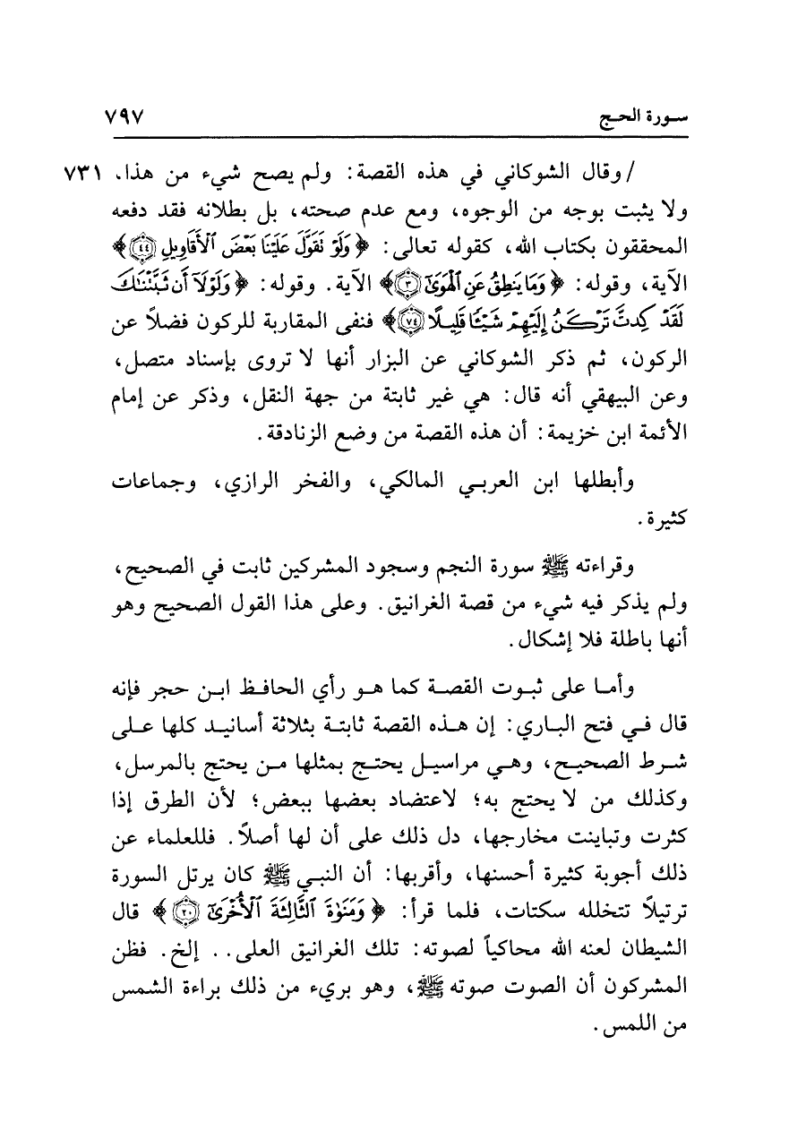 وقال الشوكاني في هذه القصة: ولم يصح شيء من هذا، ولا يثبت بوجه من الوجوه، ومع عدم صحته، بل بطلانه فقد دفعه المحققون بكتاب الله، كقوله تعالى: {وَلَوْ تَقَوَّلَ عَلَيْنَا بَعْضَ الْأَقَاوِيلِ (٤٤)} الآية، وقوله: {وَمَا يَنْطِقُ عَنِ الْهَوَى (٣)} الآية. وقوله: {وَلَوْلَا أَنْ ثَبَّتْنَاكَ لَقَدْ كِدْتَ تَرْكَنُ إِلَيْهِمْ شَيْئًا قَلِيلًا (٧٤)} فنفى المقاربة للركون فضلًا عن الركون، ثم ذكر الشوكاني عن البزار أنها لا تروى بإسناد متصل، وعن البيهقي أنه قال: هي غير ثابتة من جهة النقل، وذكر عن إمام الأئمة ابن خزيمة: أن هذه القصة من وضع الزنادقة.