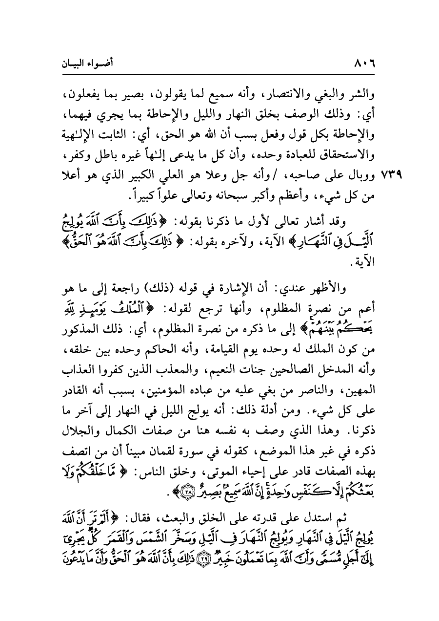 والأظهر عندي: أن الإِشارة في قوله (ذلك) راجعة إلى ما هو أعم من نصر المظلوم، وأنها ترجع لقوله: {الْمُلْكُ يَوْمَئِذٍ لِلَّهِ يَحْكُمُ بَيْنَهُمْ} إلى ما ذكره من نصرة المظلوم، أي: ذلك المذكور من كون الملك له وحده يوم القيامة، وأنه الحاكم وحده بين خلقه، وأنه المدخل الصالحين جنات النعيم، والمعذب الذين كفروا العذاب المهين، والناصر من بغي عليه من عباده المؤمنين، بسبب أنه القادر على كل شيء. ومن أدلة ذلك: أنه يولج الليل في النهار إلى آخر ما ذكرنا. وهذا الذي وصف به نفسه هنا من صفات الكمال والجلال ذكره في غير هذا الموضع، كقوله في سورة لقمان مبينًا أن من اتصف بهذه الصفات قادر على إحياء الموتى، وخلق الناس: {مَا خَلْقُكُمْ وَلَا بَعْثُكُمْ إِلَّا كَنَفْسٍ وَاحِدَةٍ إِنَّ اللَّهَ سَمِيعٌ بَصِيرٌ (٢٨)}.