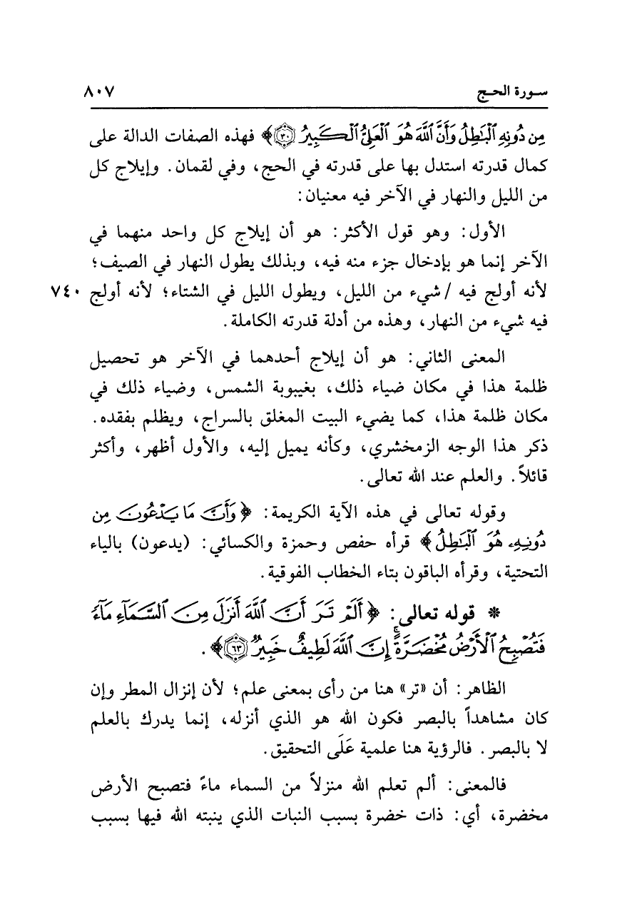 مِنْ دُونِهِ الْبَاطِلُ وَأَنَّ اللَّهَ هُوَ الْعَلِيُّ الْكَبِيرُ (٣٠)} فهذه الصفات الدالة على كمال قدرته استدل بها على قدرته في الحج، وفي لقمان. وإيلاج كل من الليل والنهار في الآخر فيه معنيان: