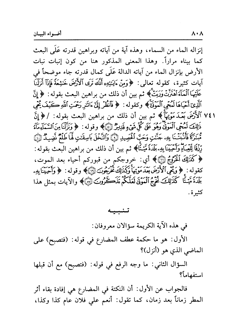 فالجواب عن الأول: أن النكتة في المضارع هي إفادة بقاء أثر المطر زمانًا بعد زمان، كما تقول: أنعم علي فلان عام كذا وكذا،