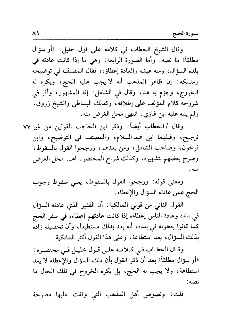 وقال الشيخ الحطاب في كلامه على قول خليل: "أو سؤال مطلقًا" ما نصه: وأما الصورة الرابعة: وهي ما إذا كانت عادته في بلده السؤال، ومنه عيشه والعادة إعطاؤه، فقال المصنِّف في توضيحه ومنسكه: إن ظاهر المذهب أنَّه لا يجب عليه الحج، ويكره له الخروج، وجزم به هنا، وقال في الشامل: إنه المشهور، وأقر في شروحه كلام المؤلف على إطلاقه، وكذلك البساطي والشيخ زروق، ولم ينبه عليه ابن غازي. انتهى محل الغرض منه.