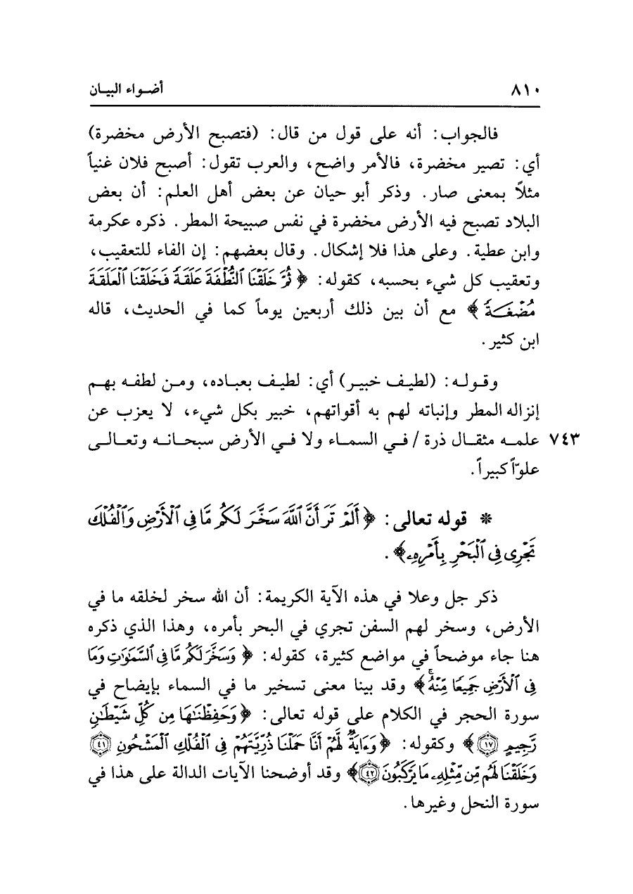• قوله تعالى: {أَلَمْ تَرَ أَنَّ اللَّهَ سَخَّرَ لَكُمْ مَا فِي الْأَرْضِ وَالْفُلْكَ تَجْرِي فِي الْبَحْرِ بِأَمْرِهِ}.