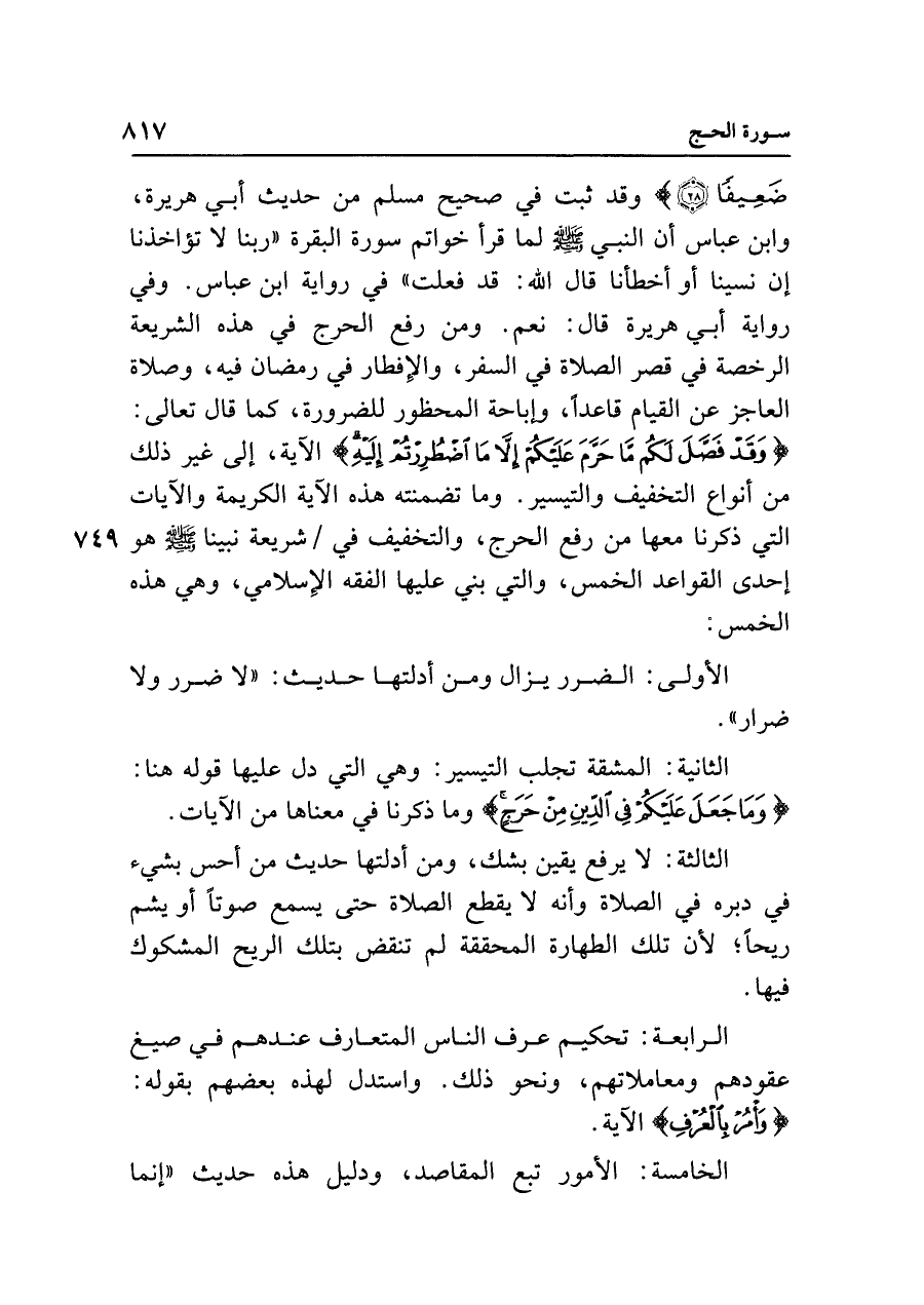 ضَعِيفًا (٢٨)} وقد ثبت في صحيح مسلم من حديث أبي هريرة، وابن عباس أن النبي - صلى الله عليه وسلم - لما قرأ خواتم سورة البقرة "ربنا لا تؤاخذنا إن نسينا أو أخطأنا قال الله: قد فعلت" في رواية ابن عباس. وفي رواية أبي هريرة قال: نعم. ومن رفع الحرج في هذه الشريعة الرخصة في قصر الصلاة في السفر، والإفطار في رمضان فيه، وصلاة العاجز عن القيام قاعدًا، وإباحة المحظور للضرورة، كما قال تعالى: {وَقَدْ فَصَّلَ لَكُمْ مَا حَرَّمَ عَلَيْكُمْ إِلَّا مَا اضْطُرِرْتُمْ إِلَيْهِ} الآية، إلى غير ذلك من أنواع التخفيف والتيسير. وما تضمنته هذه الآية الكريمة والآيات التي ذكرنا معها من رفع الحرج، والتخفيف في شريعة نبينا - صلى الله عليه وسلم - هو إحدى القواعد الخمس، والتي بني عليها الفقه الإسلامي، وهي هذه الخمس: