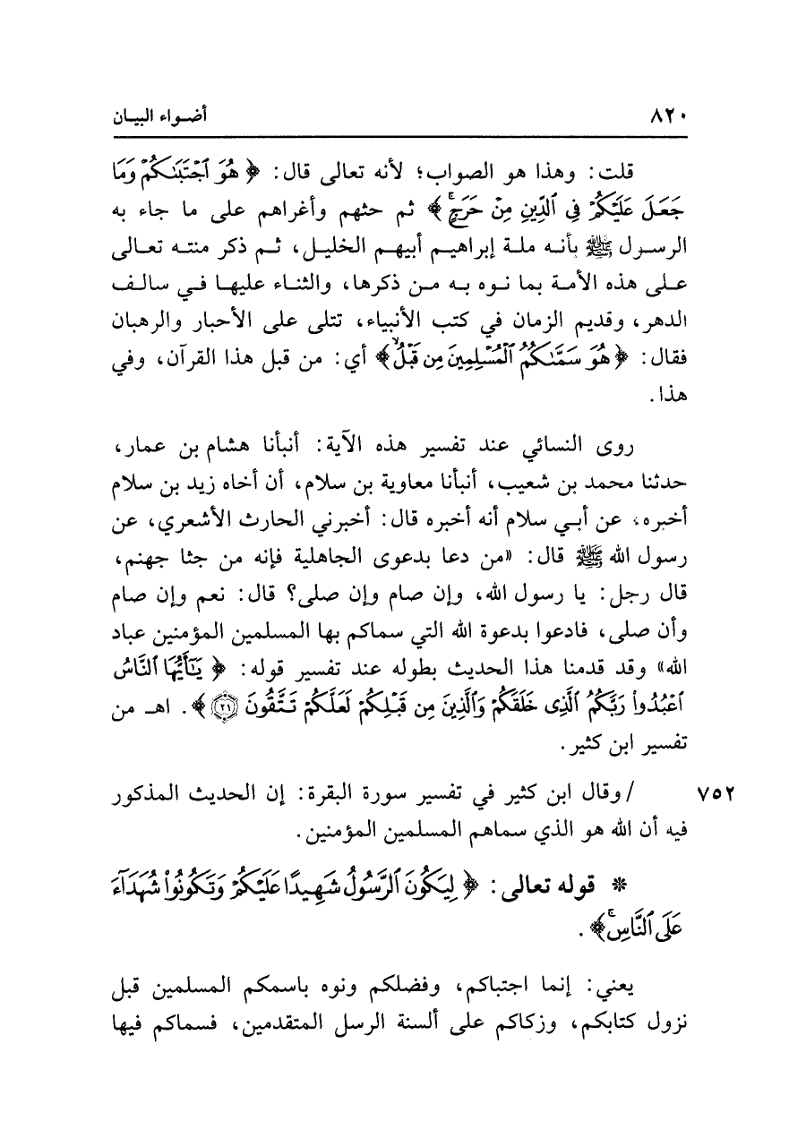 قلت: وهذا هو الصواب؛ لأنه تعالى قال: {هُوَ اجْتَبَاكُمْ وَمَا جَعَلَ عَلَيْكُمْ فِي الدِّينِ مِنْ حَرَجٍ} ثم حثهم وأغراهم على ما جاء به الرسول - صلى الله عليه وسلم - بأنه ملة إبراهيم أبيهم الخليل، ثم ذكر منته تعالى على هذه الأمة بما نوه به من ذكرها، والثناء عليها في سالف الدهر، وقديم الزمان في كتب الأنبياء، تتلى على الأحبار والرهبان فقال: {هُوَ سَمَّاكُمُ الْمُسْلِمِينَ مِنْ قَبْلُ} أي: من قبل هذا القرآن، وفي هذا.