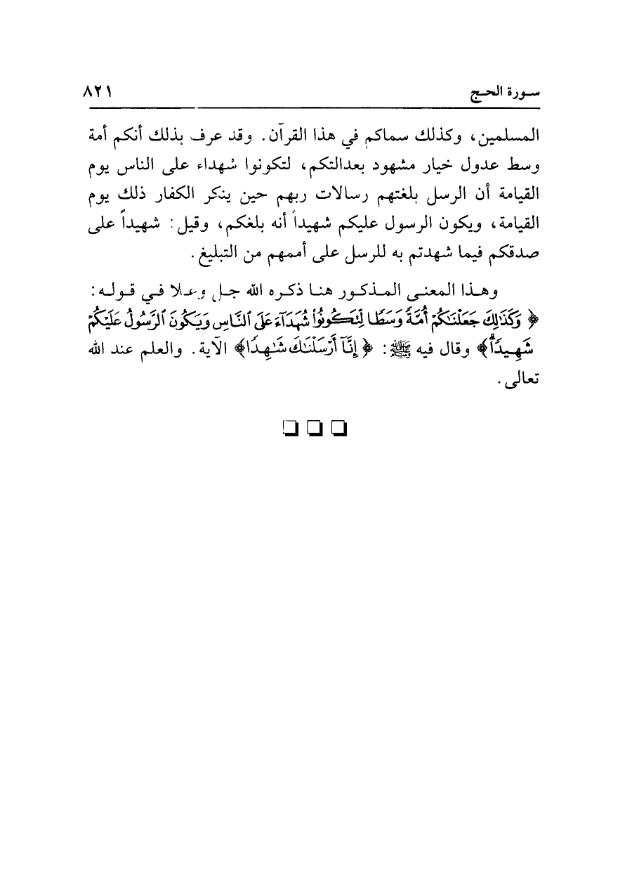 وهذا المعنى المذكور هنا ذكره الله جل وعلا في قوله: {وَكَذَلِكَ جَعَلْنَاكُمْ أُمَّةً وَسَطًا لِتَكُونُوا شُهَدَاءَ عَلَى النَّاسِ وَيَكُونَ الرَّسُولُ عَلَيْكُمْ شَهِيدًا} وقال فيه - صلى الله عليه وسلم -: {إِنَّا أَرْسَلْنَاكَ شَاهِدًا} الآية. والعلم عند الله تعالى.