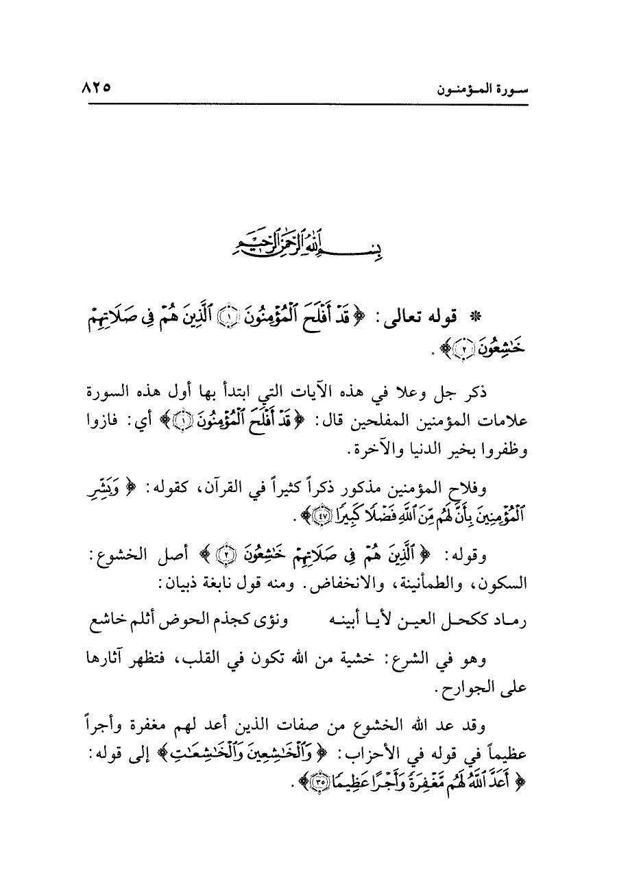• قوله تعالى: {قَدْ أَفْلَحَ الْمُؤْمِنُونَ (١) الَّذِينَ هُمْ فِي صَلَاتِهِمْ خَاشِعُونَ (٢)}.