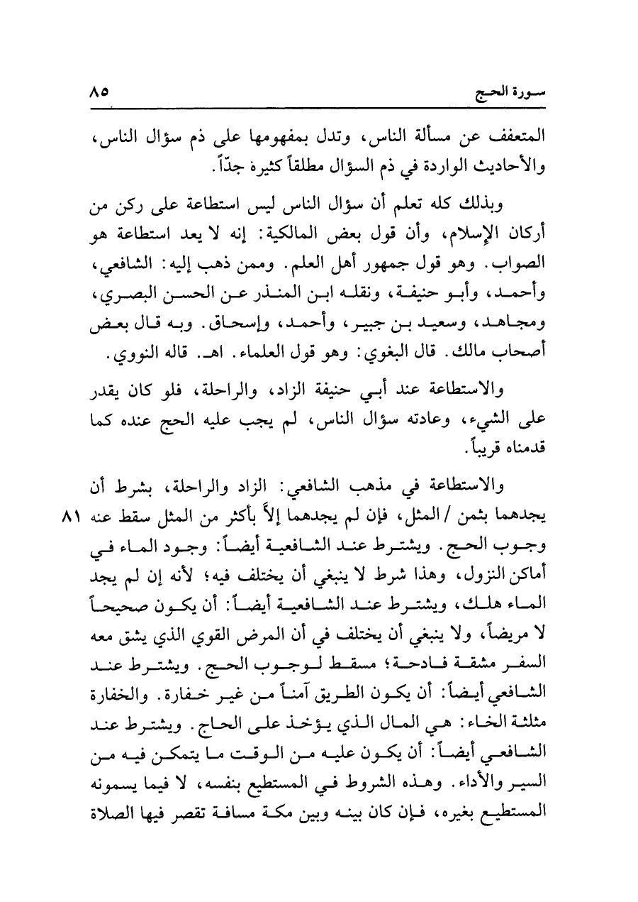 وبذلك كله تعلم أن سؤال الناس ليس استطاعة على ركن من أركان الإِسلام، وأن قول بعض المالكية: إنه لا يعد استطاعة هو الصواب. وهو قول جمهور أهل العلم. وممن ذهب إليه: الشَّافعي، وأحمد، وأَبو حنيفة، ونقله ابن المنذر عن الحسن البصري، ومجاهد، وسعيد بن جبير، وأحمد، وإسحاق. وبه قال بعض أصحاب مالك. قال البغوي: وهو قول العلماء. اهـ. قاله النووي.