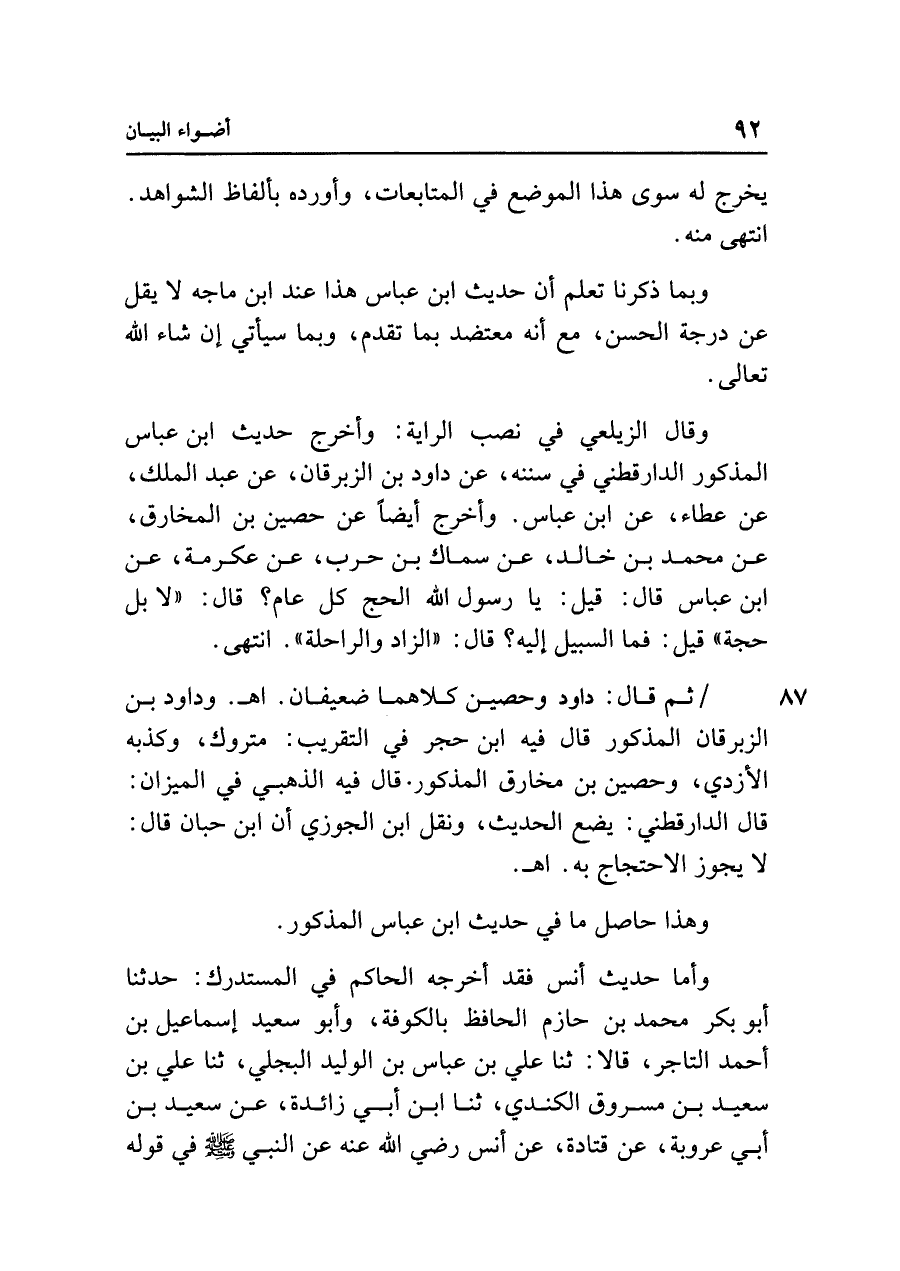 وقال الزيلعي في نصب الراية: وأخرج حديث ابن عبَّاس المذكور الدَّارَقُطني في سننه، عن داود بن الزبرقان، عن عبد الملك، عن عطاء، عن ابن عبَّاس. وأخرج أيضًا عن حصين بن المخارق، عن محمد بن خالد، عن سماك بن حرب، عن عكرمة، عن ابن عبَّاس قال: قيل: يا رسول الله الحج كل عام؟ قال: "لا بل حجة" قيل: فما السبيل إليه؟ قال: "الزاد والراحلة". انتهى.