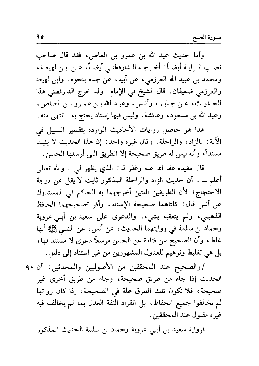 قال مقيده عفا الله عنه وغفر له: الذي يظهر لي - والله تعالى أعلم - : أن حديث الزاد والراحلة المذكور ثابت لا يقل عن درجة الاحتجاج؛ لأن الطريقين اللتين أخرجهما به الحاكم في المستدرك عن أَنس قال: كلتاهما صحيحة الإِسناد، وأقر تصحيحهما الحافظ الذهبي، ولم يتعقبه بشيء. والدعوى على سعيد بن أبي عروبة وحماد بن سلمة في روايتهما الحديث، عن أَنس، عن النبي - صلى الله عليه وسلم - أنَّها غلط، وأن الصحيح عن قَتَادة عن الحسن مرسلًا دعوى لا مستند لها، بل هي تغليط وتوهيم للعدول المشهورين من غير استناد إلى دليل.