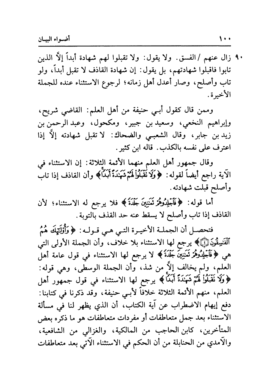 فتحصل أن الجملة الأخيرة التي هي قوله: {وَأُولَئِكَ هُمُ الْفَاسِقُونَ (٤)} يرجع لها الاستثناء بلا خلاف، وأن الجملة الأولى التي هي {فَاجْلِدُوهُمْ ثَمَانِينَ جَلْدَةً} لا يرجع لها الاستثناء في قول عامة أهل العلم، ولم يخالف إلَّا من شذ، وأن الجملة الوسطى، وهي قوله: {وَلَا تَقْبَلُوا لَهُمْ شَهَادَةً أَبَدًا} يرجع لها الاستثناء في قول جمهور أهل العلم، منهم الأئمة الثلاثة خلافًا لأبي حنيفة، وقد ذكرنا في كتابنا: دفع إيهام الاضطراب عن آية الكتاب، أن الذي يظهر لنا في مسألة الاستثناء بعد جمل متعاطفات أو مفردات متعاطفات هو ما ذكره بعض المتأخرين، كابن الحاجب من المالكية، والغزالي من الشافعية، والآمدي من الحنابلة من أن الحكم في الاستثناء الآتي بعد متعاطفات