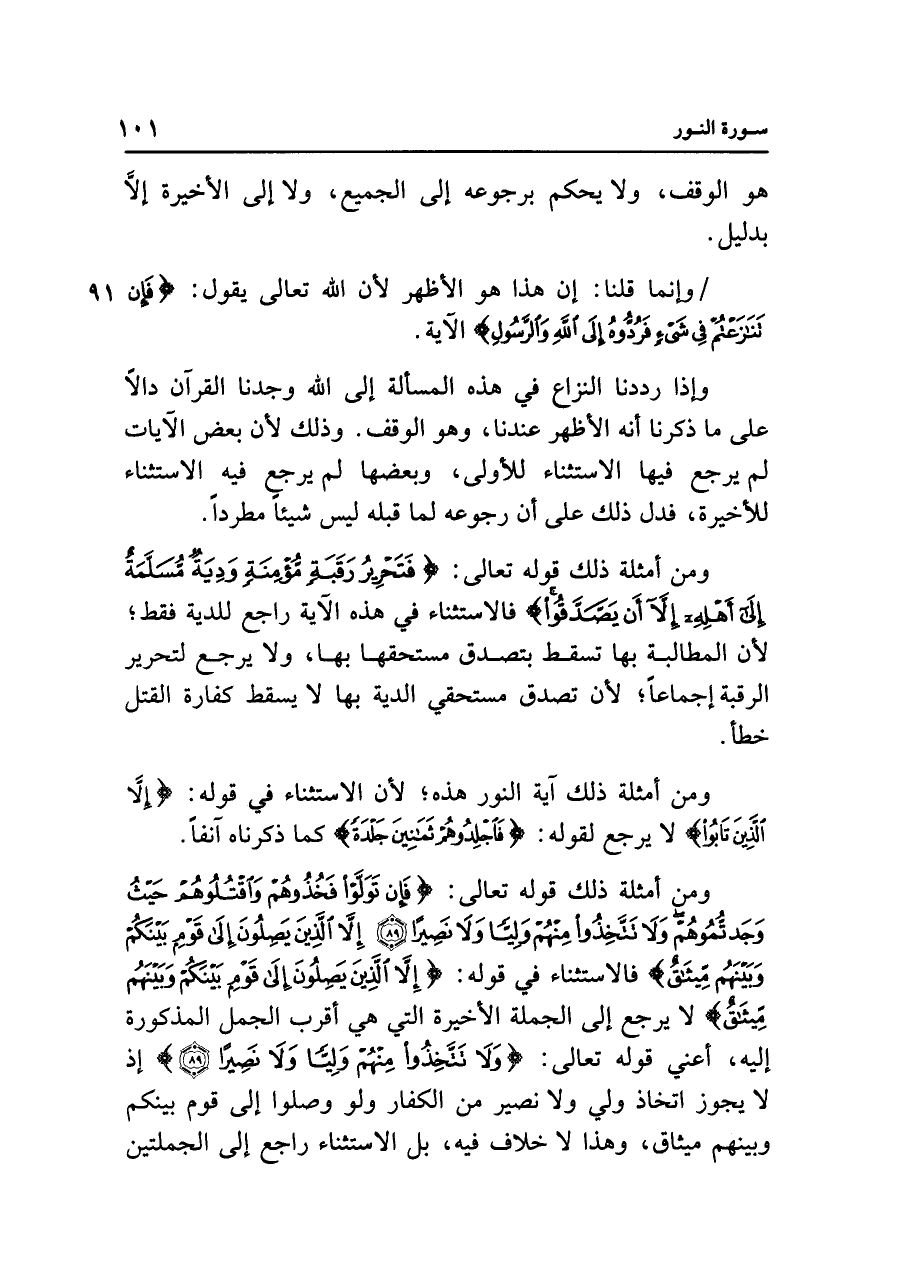 ومن أمثلة ذلك قوله تعالى: {فَإِنْ تَوَلَّوْا فَخُذُوهُمْ وَاقْتُلُوهُمْ حَيْثُ وَجَدْتُمُوهُمْ وَلَا تَتَّخِذُوا مِنْهُمْ وَلِيًّا وَلَا نَصِيرًا (٨٩) إِلَّا الَّذِينَ يَصِلُونَ إِلَى قَوْمٍ بَيْنَكُمْ وَبَيْنَهُمْ مِيثَاقٌ} فالاستثناء في قوله: {إِلَّا الَّذِينَ يَصِلُونَ إِلَى قَوْمٍ بَيْنَكُمْ وَبَيْنَهُمْ مِيثَاقٌ} لا يرجع إلى الجملة الأخيرة التي هي أقرب الجمل المذكورة إليه، أعني قوله تعالى: {وَلَا تَتَّخِذُوا مِنْهُمْ وَلِيًّا وَلَا نَصِيرًا (٨٩)} إذ لا يجوز اتخاذ ولي ولا نصير من الكفار ولو وصلوا إلى قوم بينكم وبينهم ميثاق، وهذا لا خلاف فيه، بل الاستثناء راجع إلى الجملتين