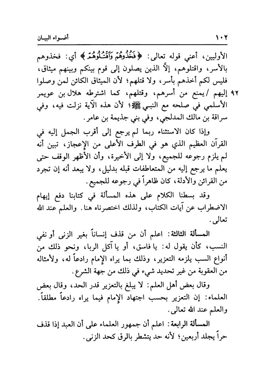 الأوليين، أعني قوله تعالى: {فَحُذُوهُمْ وَاقْتُلُوهُمْ} أي: فخذوهم بالأسر، واقتلوهم، إلَّا الذين يصلون إلى قوم بينكم وبينهم ميثاق، فليس لكم أخذهم بأسر، ولا قتلهم؛ لأن الميثاق الكائن لمن وصلوا إليهم يمنع من أسرهم، وقتلهم، كما اشترطه هلال بن عويمر الأسلمي في صلحه مع النبي - صلى الله عليه وسلم - ؛ لأن هذه الآية نزلت فيه، وفي سراقة بن مالك المدلجي، وفي بني جذيمة بن عامر.