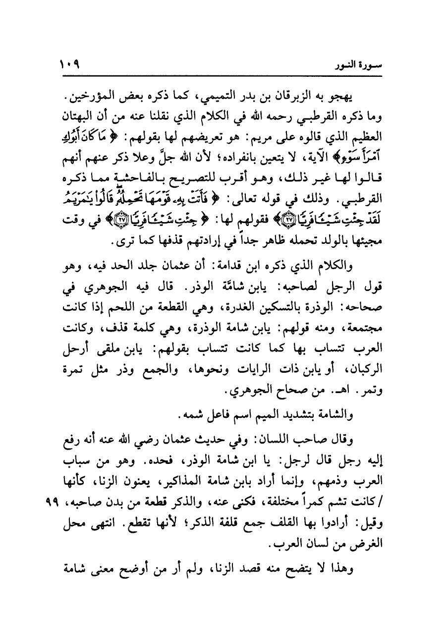 يهجو به الزبرقان بن بدر التميمي، كما ذكره بعض المؤرخين. وما ذكره القرطبي رحمه الله في الكلال الذي نقلنا عنه من أن البهتان العظيم الذي قالوه على مريم: هو تعريضهم لها بقولهم: {مَا كَانَ أَبُوكِ امْرَأَ سَوْءٍ} الآية، لا يتعين بانفراده؛ لأنَّ الله جلَّ وعلا ذكر عنهم أنهم قالوا لها غير ذلك، وهو أقرب للتصريح بالفاحشة مما ذكره القرطبي. وذلك في قوله تعالى: {فَأَتَتْ بِهِ قَوْمَهَا تَحْمِلُهُ قَالُوا يَامَرْيَمُ لَقَدْ جِئْتِ شَيْئًا فَرِيًّا (٢٧)} فقولهم لها: {جِئْتِ شَيْئًا فَرِيًّا (٢٧)} في وقت مجيئها بالولد تحملة ظاهر جدًّا في إرادتهم قذفها كما ترى.