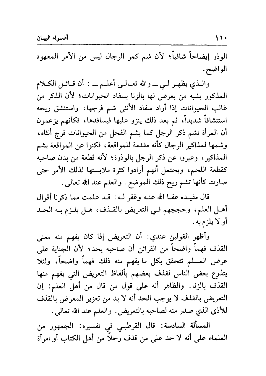 وأظهر القولين عندي: أن التعريض إذا كان يفهم منه معنى القذف فهمًا واضحًا من القرائن أن صاحبه يحد، لأن الجناية على عرض المسلم تتحقق بكل ما يفهم منه ذلك فهمًا واضحًا، ولئلا يتذرع بعض الناس لقذف بعضهم بألفاظ التعريض التي يفهم منها القذف بالزنا. والظاهر أنَّه على قول من قال من أهل العلم: إن التعريض بالقذف لا يوجب الحد أنَّه لا بد من تعزير المعرض بالقذف للأذى الذي صدر منه لصاحبه بالتعريض. والعلم عند الله تعالى.