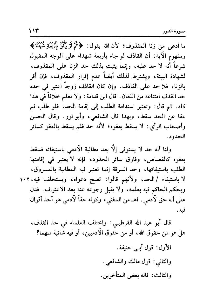 قال أَبو عبد الله القرطبي: واختلف العلماء في حد القذف، هل هو من حقوق الله، أو من حقوق الآدميين، أو فيه شائبة منهما؟
