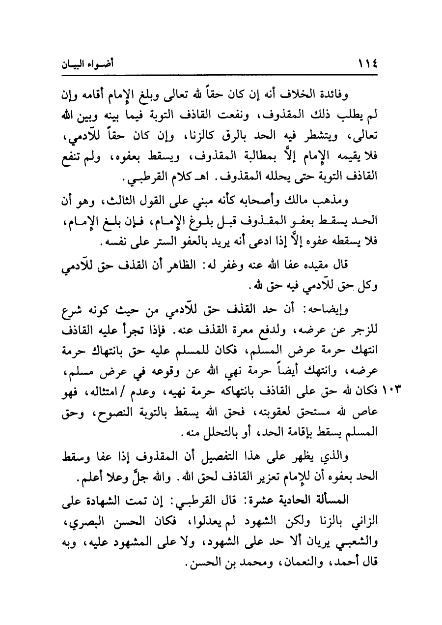 وفائدة الخلاف أنَّه إن كان حقًا للَّه تعالى وبلغ الإِمام أقامه وإن لم يطلب ذلك المقذوف، ونفعت القاذف التوبة فيما بينه وبين الله تعالى، ويتشطر فيه الحد بالرق كالزنا، وإن كان حقًا للآدمي، فلا يقيمه الإِمام إلَّا بمطالبة المقذوف، ويسقط بعفوه، ولم تنفع القاذف التوبة حتَّى يحلله المقذوف. اهـ كلام القرطبي.