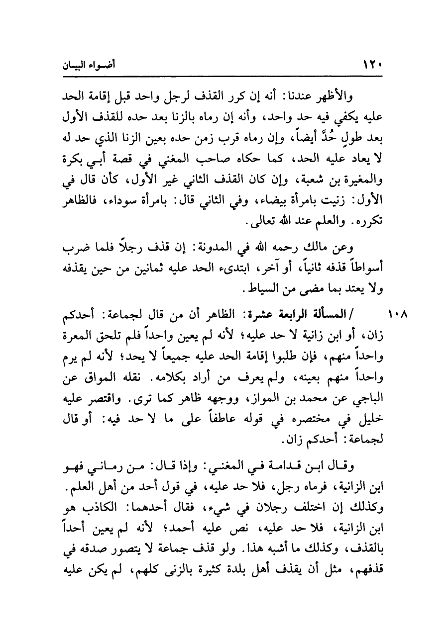 المسألة الرابعة عشرة: الظاهر أن من قال لجماعة: أحدكم زان، أو ابن زانية لا حد عليه؛ لأنه لم يعين واحدًا فلم تلحق المعرة واحدًا منهم، فإن طلبوا إقامة الحد عليه جميعًا لا يحد؛ لأنه لم يرم واحدًا منهم بعينه، ولم يعرف من أراد بكلامه. نقله المواق عن الباجي عن محمد بن المواز، ووجهه ظاهر كما ترى. واقتصر عليه خليل في مختصره في قوله عاطفًا على ما لا حد فيه: أو قال لجماعة: أحدكم زان.