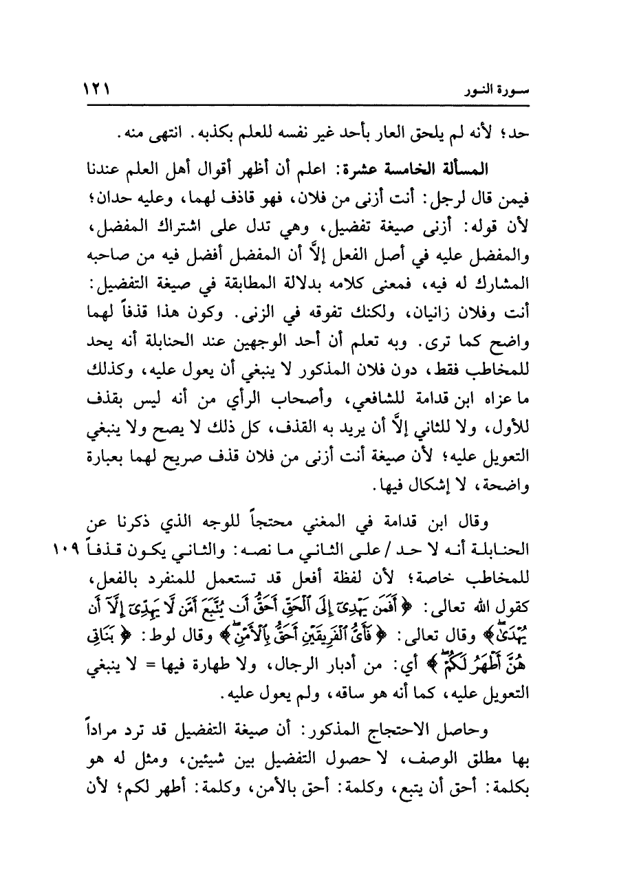 وقال ابن قدامة في المغني محتجًا للوجه الذي ذكرنا عن الحنابلة أنَّه لا حد على الثاني ما نصه: والثاني يكون قذفًا للمخاطب خاصة؛ لأن لفظة أفعل قد تستعمل للمنفرد بالفعل، كقول الله تعالى: {أَفَمَنْ يَهْدِي إِلَى الْحَقِّ أَحَقُّ أَنْ يُتَّبَعَ أَمَّنْ لَا يَهِدِّي إِلَّا أَنْ يُهْدَى} وقال تعالى: {فَأَيُّ الْفَرِيقَيْنِ أَحَقُّ بِالْأَمْنِ} وقال لوط: {بَنَاتِي هُنَّ أَطْهَرُ لَكُمْ} أي: من أدبار الرجال، ولا طهارة فيها = لا ينبغي التعويل عليه، كما أنَّه هو ساقه، ولم يعول عليه.