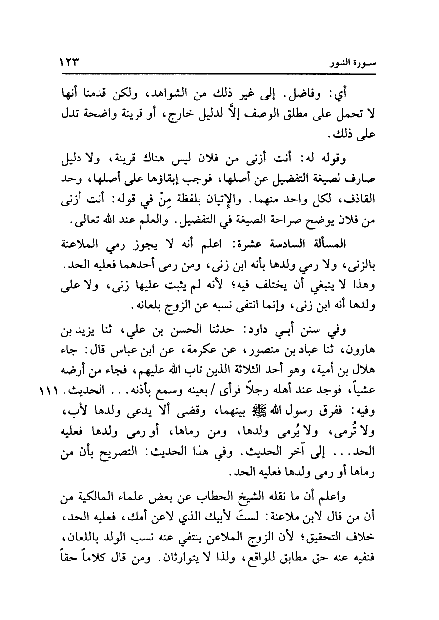 واعلم أن ما نقله الشيخ الحطاب عن بعض علماء المالكية من أن من قال لابن ملاعنة: لستَ لأبيك الذي لاعن أمك، فعليه الحد، خلاف التحقيق، لأن الزوج الملاعن ينتفي عنه نسب الولد باللعان، فنفيه عنه حق مطابق للواقع، ولذا لا يتوارثان. ومن قال كلامًا حقًا