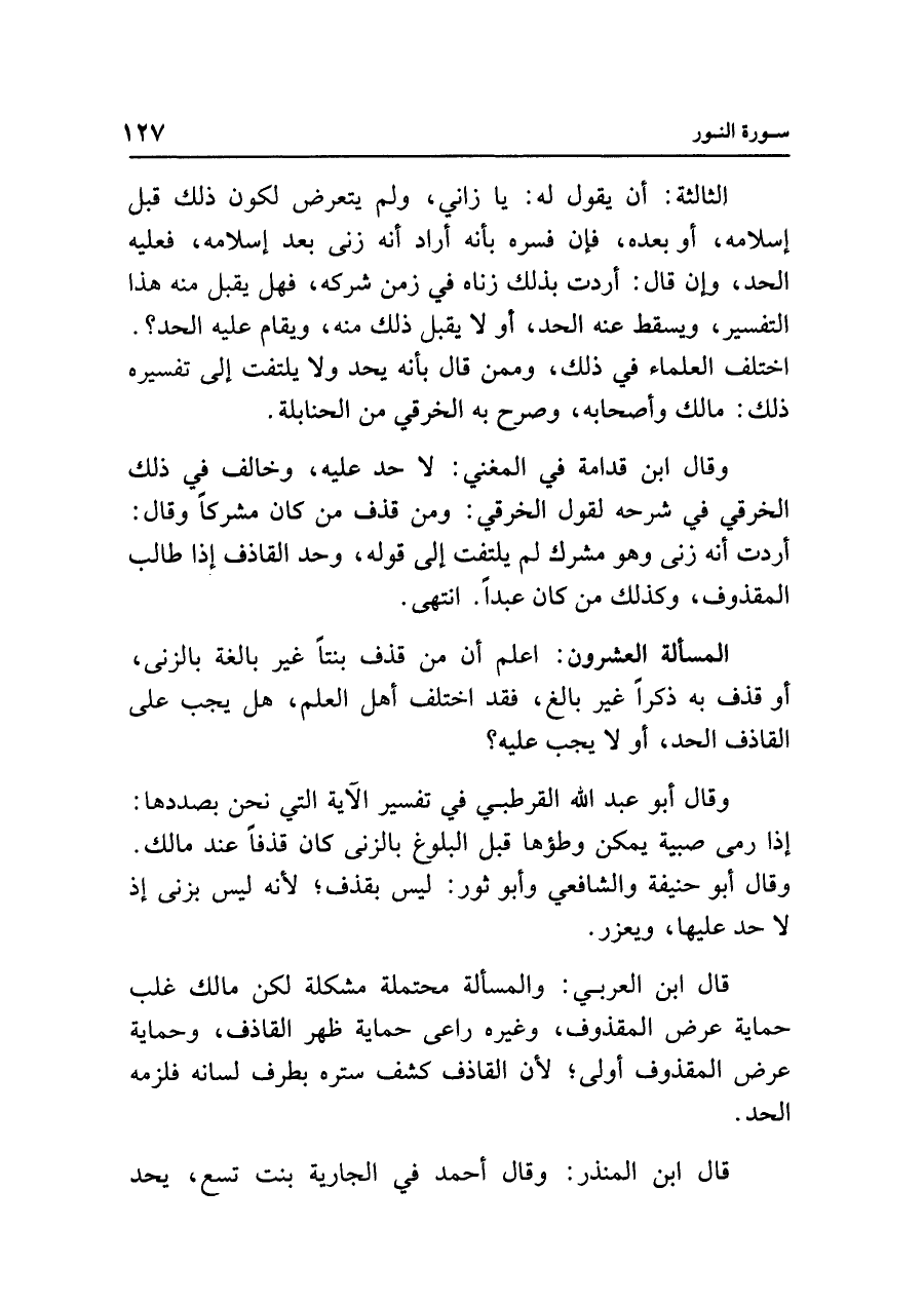 المسألة العشرون: اعلم أن من قذف بنتًا غير بالغة بالزنى، أو قذف به ذكرًا غير بالغ، فقد اختلف أهل العلم، هل يجب على القاذف الحد، أو لا يجب عليه؟
