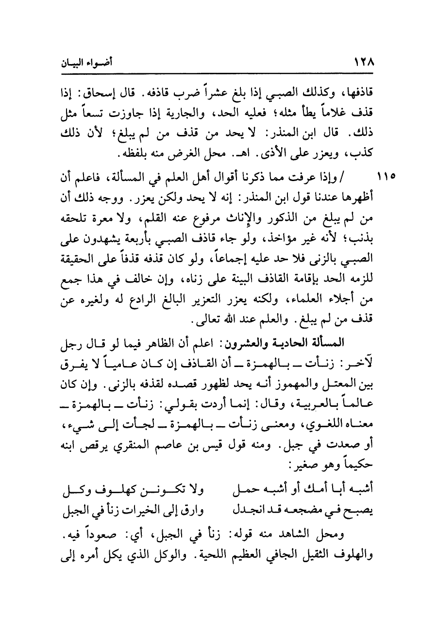 المسألة الحادية والعشرون: اعلم أن الظاهر فيما لو قال رجل لآخر: زنأت - بالهمزة - أن القاذف إن كان عاميًا لا يفرق بين المعتل والمهموز أنَّه يحد لظهور قصده لقذفه بالزنى. وإن كان عالمًا بالعربية، وقال: إنما أردت بقولي: زنأت - بالهمزة - معناه اللغوي، ومعنى زنأت - بالهمزة - لجأت إلى شيء، أو صعدت في جبل. ومنه قول قيس بن عاصم المنقري يرقص ابنه حكيمًا وهو صغير: