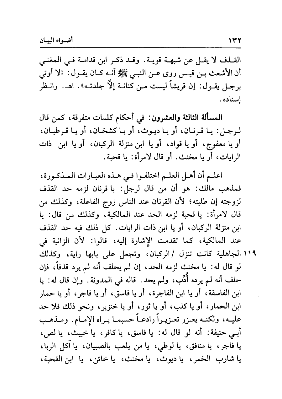 اعلم أن أهل العلم اختلفوا في هذه العبارات المذكورة، فمذهب مالك: هو أن من قال لرجل: يا قرنان لزمه حد القذف لزوجته إن طلبته؛ لأن القرنان عند الناس زوج الفاعلة، وكذلك من قال لامرأة: يا قحبة لزمه الحد عند المالكية، وكذلك من قال: يا ابن منزلة الركبان، أو يا ابن ذات الرايات. كل ذلك فيه حد القذف عند المالكية، كما تقدمت الإِشارة إليه، قالوا: لأن الزانية في الجاهلية كانت تنزل الركبان، وتجعل على بابها راية، وكذلك لو قال له: يا مخنث لزمه الحد، إن لم يحلف أنَّه لم يرد قذفًا، فإن حلف أنَّه لم يرده أُدِّب، ولم يحد. قاله في المدونة. وإن قال له: يا ابن الفاسقة، أو يا ابن الفاجرة، أو يا فاسق، أو يا فاجر، أو يا حمار ابن الحمار، أو يا كلب، أو يا ثور، أو يا خنزير، ونحو ذلك فلا حد عليه، ولكنه يعزر تعزيزًا رادعًا حسبما يراه الإِمام. ومذهب أبي حنيفة: أنَّه لو قال له: يا فاسق، يا كافر، يا خبيث، يا لص، يا فاجر، يا منافق، يا لوطي، يا من يلعب بالصبيان، يا آكل الرِّبَا، يا شارب الخمر، يا ديوث، يا مخنث، يا خائن، يا ابن القحبة،