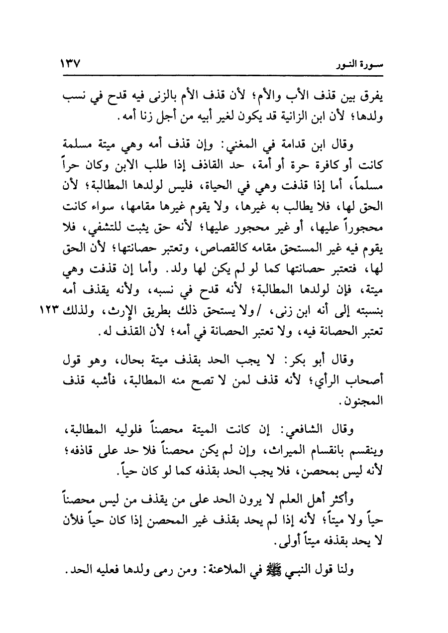 وقال ابن قدامة في المغني: وإن قذف أمه وهي ميتة مسلمة كانت أو كافرة حرة أو أمة، حد القاذف إذا طلب الابن وكان حرًا مسلمًا، أما إذا قذفت وهي في الحياة، فليس لولدها المطالبة؛ لأن الحق لها، فلا يطالب به غيرها، ولا يقوم غيرها مقامها، سواء كانت محجورًا عليها، أو غير محجور عليها؛ لأنه حق يثبت للتشفي، فلا يقوم فيه غير المستحق مقامه كالقصاص، وتعتبر حصانتها؛ لأن الحق لها، فتعتبر حصانتها كما لو لم يكن لها ولد. وأما إن قذفت وهي ميتة، فإن لولدها المطالبة؛ لأنه قدح في نسبه، ولأنه يقذف أمه بنسبته إلى أنَّه ابن زنى، ولا يستحق ذلك بطريق الإِرث، ولذلك تعتبر الحصانة فيه، ولا تعتبر الحصانة في أمه؛ لأن القذف له.