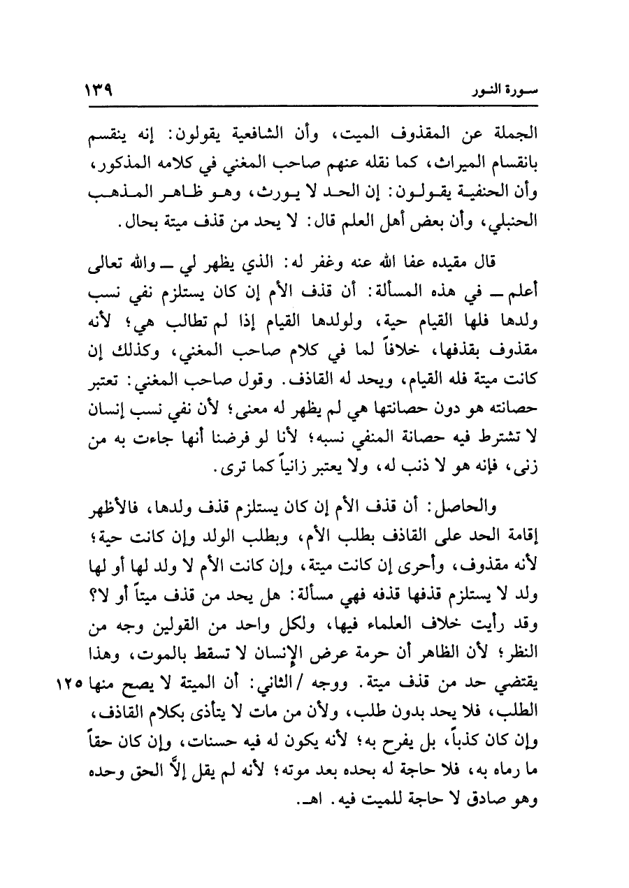 والحاصل: أن قذف الأم إن كان يستلزم قذف ولدها، فالأظهر إقامة الحد على القاذف بطلب الأم، وبطلب الولد وإن كانت حية؛ لأنه مقذوف، وأحرى إن كانت ميتة، وإن كانت الأم لا ولد لها أو لها ولد لا يستلزم قذفها قذفه فهي مسألة: هل يحد من قذف ميتًا أو لا؟ وقد رأيت خلاف العلماء فيها، ولكل واحد من القولين وجه من النظر، لأن الظاهر أن حرمة عرض الإِنسان لا تسقط بالموت، وهذا يقتضي حد من قذف ميتة. ووجه الثاني: أن الميتة لا يصح منها الطلب، فلا يحد بدون طلب، ولأن من مات لا يتأذى بكلام القاذف، وإن كان كذبًا، بل يفرح به، لأنه يكون له فيه حسنات، وإن كان حقًا ما رماه به، فلا حاجة له بحده بعد موته، لأنه لم يقل إلَّا الحق وحده وهو صادق لا حاجة للميت فيه. اهـ.