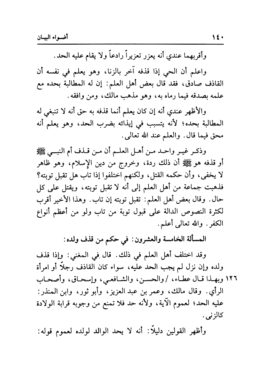 وذكر غير واحد من أهل العلم أن من قذف أم النبي - صلى الله عليه وسلم - أو قذفه هو - صلى الله عليه وسلم - أن ذلك ردة، وخروج من دين الإِسلام، وهو ظاهر لا يخفى، وأن حكمه القتل، ولكنهم اختلفوا إذا تاب هل تقبل توبته؟ فذهبت جماعة من أهل العلم إلى أنَّه لا تقبل توبته، ويقتل على كل حال. وقال بعض أهل العلم: تقبل توبته إن تاب. وهذا الأخير أقرب لكثرة النصوص الدالة على قبول توبته من تاب ولو من أعظم أنواع الكفر. واللَّه تعالى أعلم.