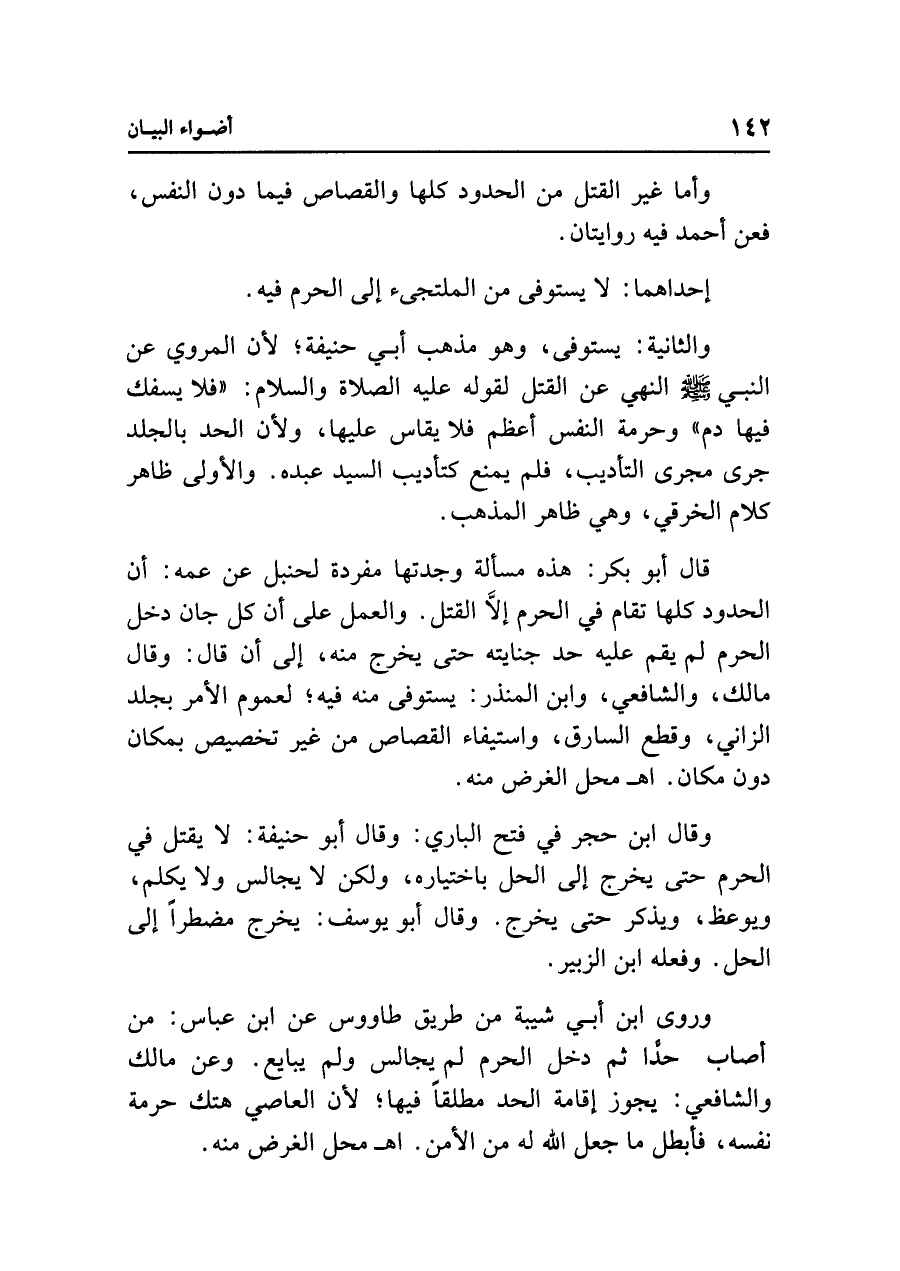 قال أَبو بكر: هذه مسألة وجدتها مفردة لحنبل عن عمه: أن الحدود كلها تقام في الحرم إلَّا القتل. والعمل على أن كل جان دخل الحرم لم يقم عليه حد جنايته حتى يخرج منه، إلى أن قال: وقال مالك، والشافعي، وابن المنذر: يستوفى منه فيه؛ لعموم الأمر بجلد الزاني، وقطع السارق، واستيفاء القصاص من غير تخصيص بمكان دون مكان. اهـ محل الغرض منه.
