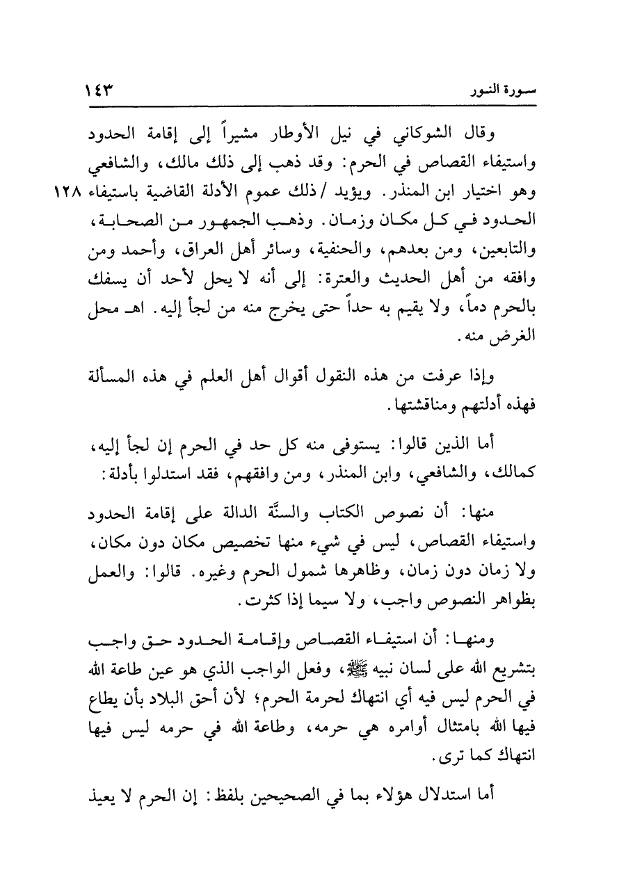 وقال الشوكاني في نيل الأوطار مشيرًا إلى إقامة الحدود واستيفاء القصاص في الحرم: وقد ذهب إلى ذلك مالك، والشافعي وهو اختيار ابن المنذر. ويؤيد ذلك عموم الأدلة القاضية باستيفاء الحدود في كل مكان وزمان. وذهب الجمهور من الصحابة، والتابعين، ومن بعدهم، والحنفية، وسائر أهل العراق، وأحمد ومن وافقه من أهل الحديث والعترة: إلى أنَّه لا يحل لأحد أن يسفك بالحرم دمًا، ولا يقيم به حدًا حتى يخرج منه من لجأ إليه. اهـ محل الغرض منه.