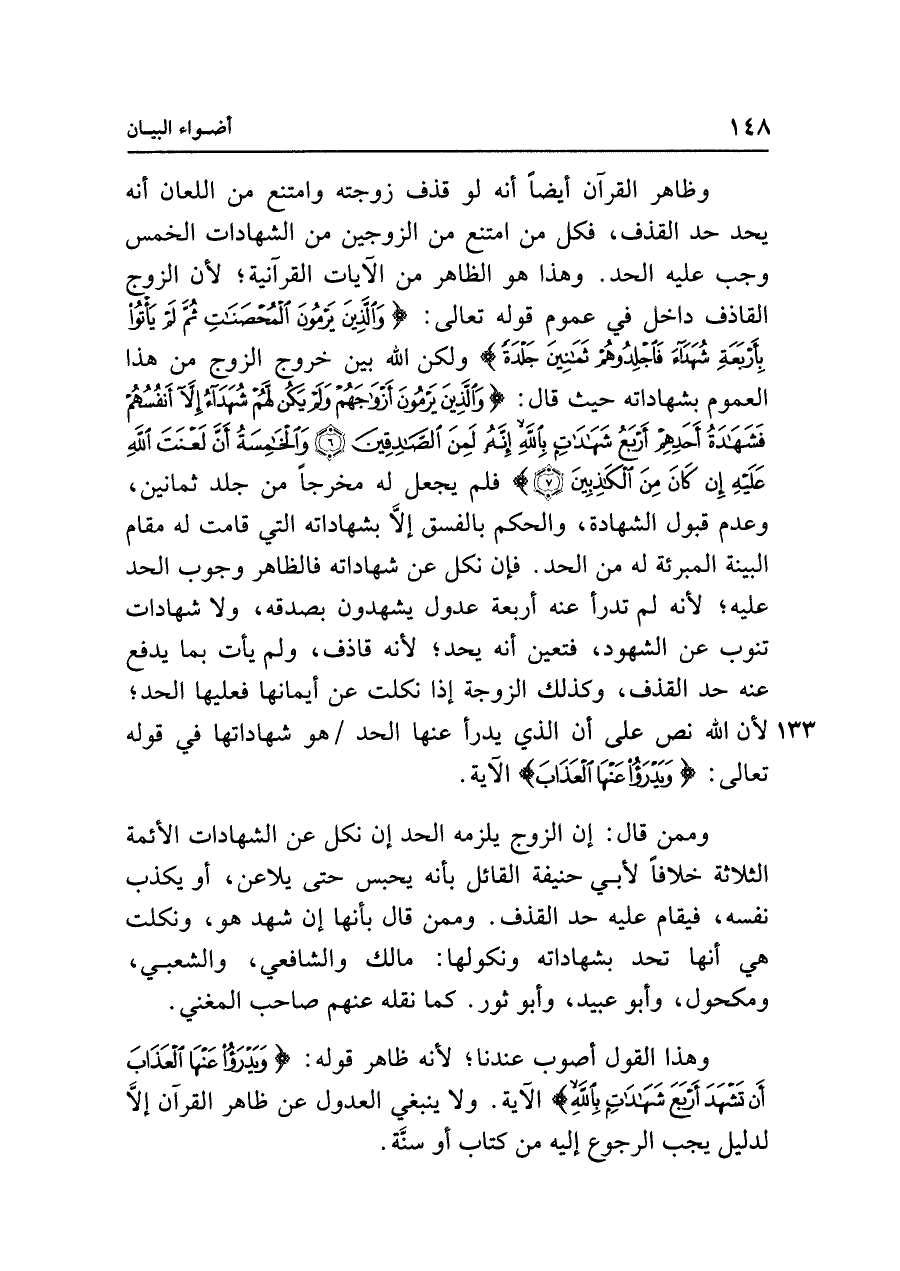 وظاهر القرآن أيضًا أنَّه لو قذف زوجته وامتنع من اللعان أنَّه يحد حد القذف، فكل من امتنع من الزوجين من الشهادات الخمس وجب عليه الحد. وهذا هو الظاهر من الآيات القرآنية؛ لأن الزوج القاذف داخل في عموم قوله تعالى: {وَالَّذِينَ يَرْمُونَ الْمُحْصَنَاتِ ثُمَّ لَمْ يَأْتُوا بِأَرْبَعَةِ شُهَدَاءَ فَاجْلِدُوهُمْ ثَمَانِينَ جَلْدَةً} ولكن الله بين خروج الزوج من هذا العموم بشهاداته حيث قال: {وَالَّذِينَ يَرْمُونَ أَزْوَاجَهُمْ وَلَمْ يَكُنْ لَهُمْ شُهَدَاءُ إِلَّا أَنْفُسُهُمْ فَشَهَادَةُ أَحَدِهِمْ أَرْبَعُ شَهَادَاتٍ بِاللَّهِ إِنَّهُ لَمِنَ الصَّادِقِينَ (٦) وَالْخَامِسَةُ أَنَّ لَعْنَتَ اللَّهِ عَلَيْهِ إِنْ كَانَ مِنَ الْكَاذِبِينَ (٧)} فلم يجعل له مخرجًا من جلد ثمانين، وعدم قبول الشهادة، والحكم بالفسق إلَّا بشهاداته التي قامت له مقام البينة المبرئة له من الحد. فإن نكل عن شهاداته فالظاهر وجوب الحد عليه؛ لأنه لم تدرأ عنه أربعة عدول يشهدون بصدقه، ولا شهادات تنوب عن الشهود، فتعين أنَّه يحد؛ لأنه قاذف، ولم يأت بما يدفع عنه حد القذف، وكذلك الزوجة إذا نكلت عن أيمانها فعليها الحد؛ لأن الله نص على أن الذي يدرأ عنها الحد هو شهاداتها في قوله تعالى: {وَيَدْرَأُ عَنْهَا الْعَذَابَ} الآية.