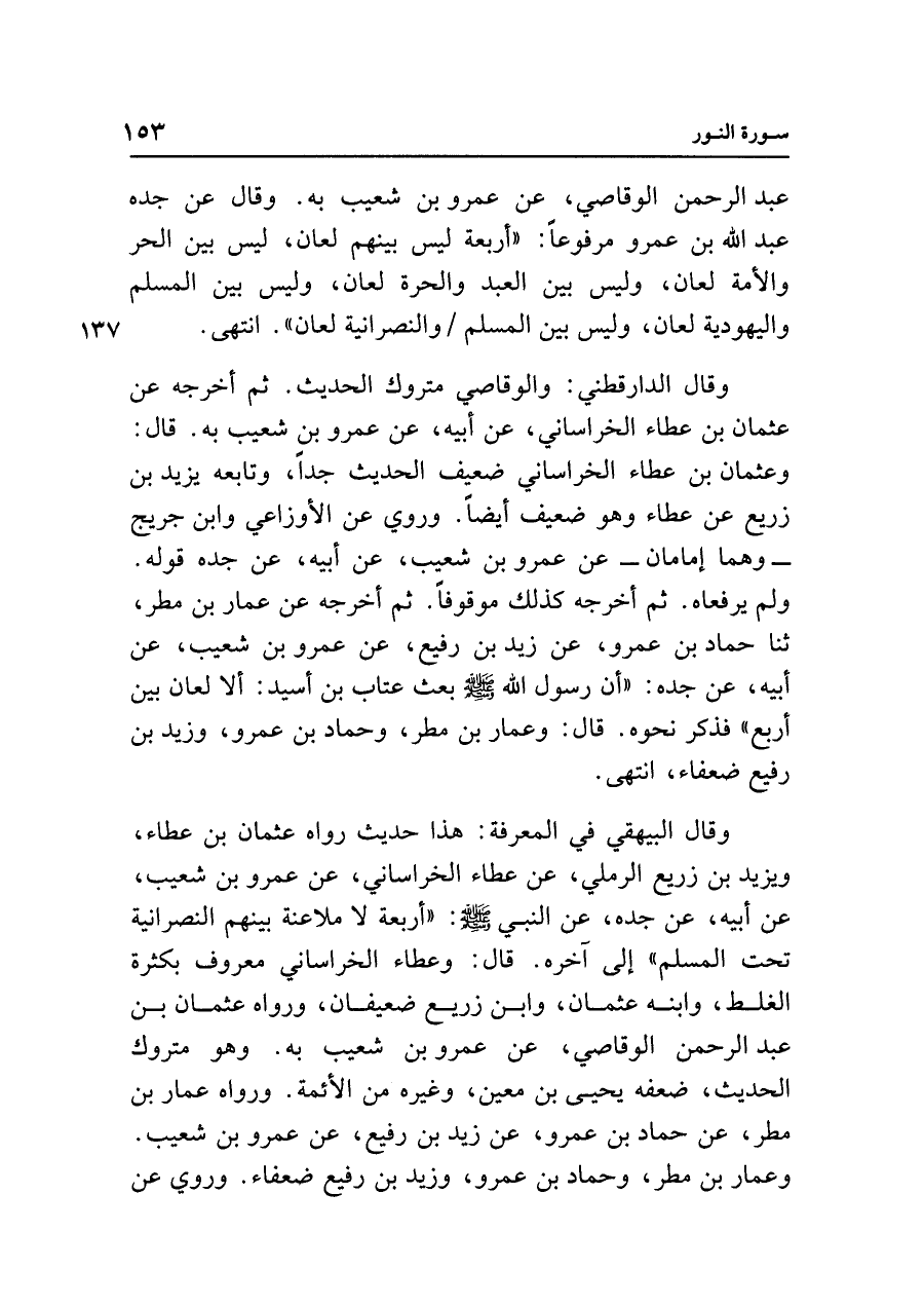 وقال الدارقطني: والوقاصي متروك الحديث. ثم أخرجه عن عثمان بن عطاء الخراساني، عن أبيه، عن عمرو بن شعيب به. قال: وعثمان بن عطاء الخراساني ضعيف الحديث جدًّا، وتابعه يزيد بن زريع عن عطاء وهو ضعيف أيضًا. وروي عن الأوزاعي وابن جريج - وهما إمامان - عن عمرو بن شعيب، عن أبيه، عن جده قوله. ولم يرفعاه. ثم أخرجه كذلك موقوفًا. ثم أخرجه عن عمار بن مطر، ثنا حماد بن عمرو، عن زيد بن رفيع، عن عمرو بن شعيب، عن أبيه، عن جده: "أن رسول الله - صلى الله عليه وسلم - بعث عتاب بن أسيد: ألا لعان بين أربع" فذكر نحوه. قال: وعمار بن مطر، وحماد بن عمرو، وزيد بن رفيع ضعفاء، انتهى.